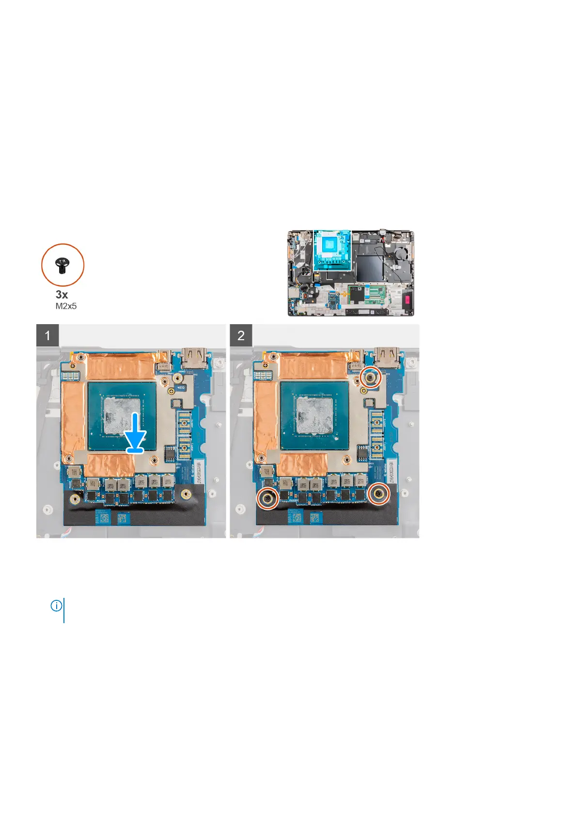 2. Replace the three (M2x5) screws to secure the GPU card to the palmrest.