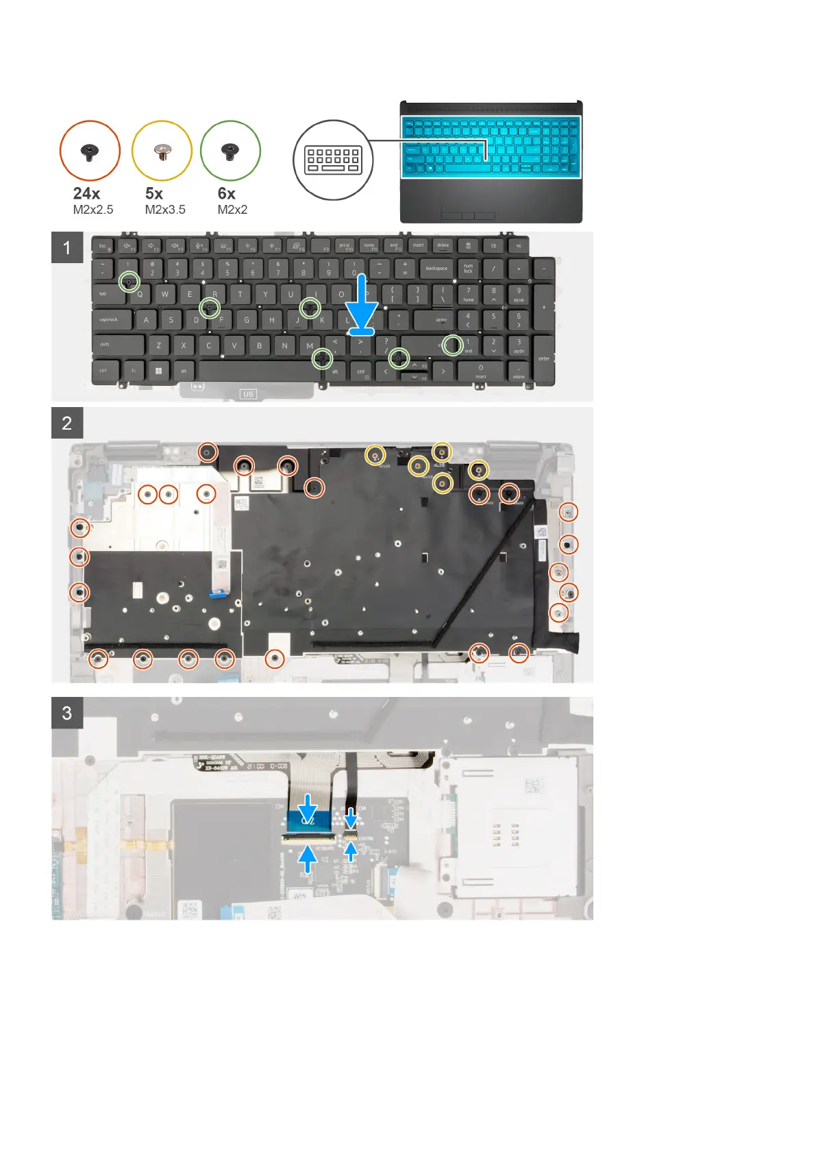 3. Replace the 24 (M2x2.5) and five (M2x3.5) screws that secure the keyboard support plate to the palmrest.