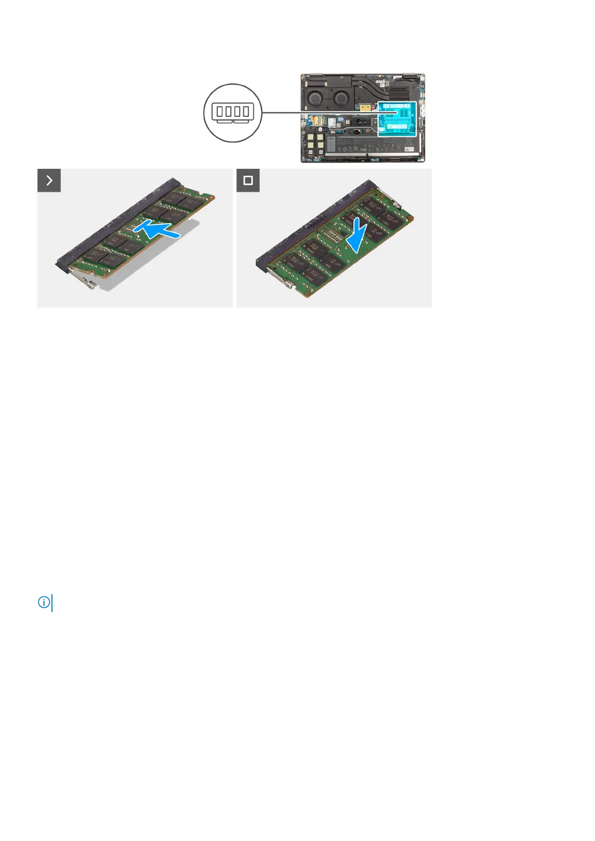 2. Slide the memory module firmly into the slot at an angle and press the memory module down until it clicks into place.