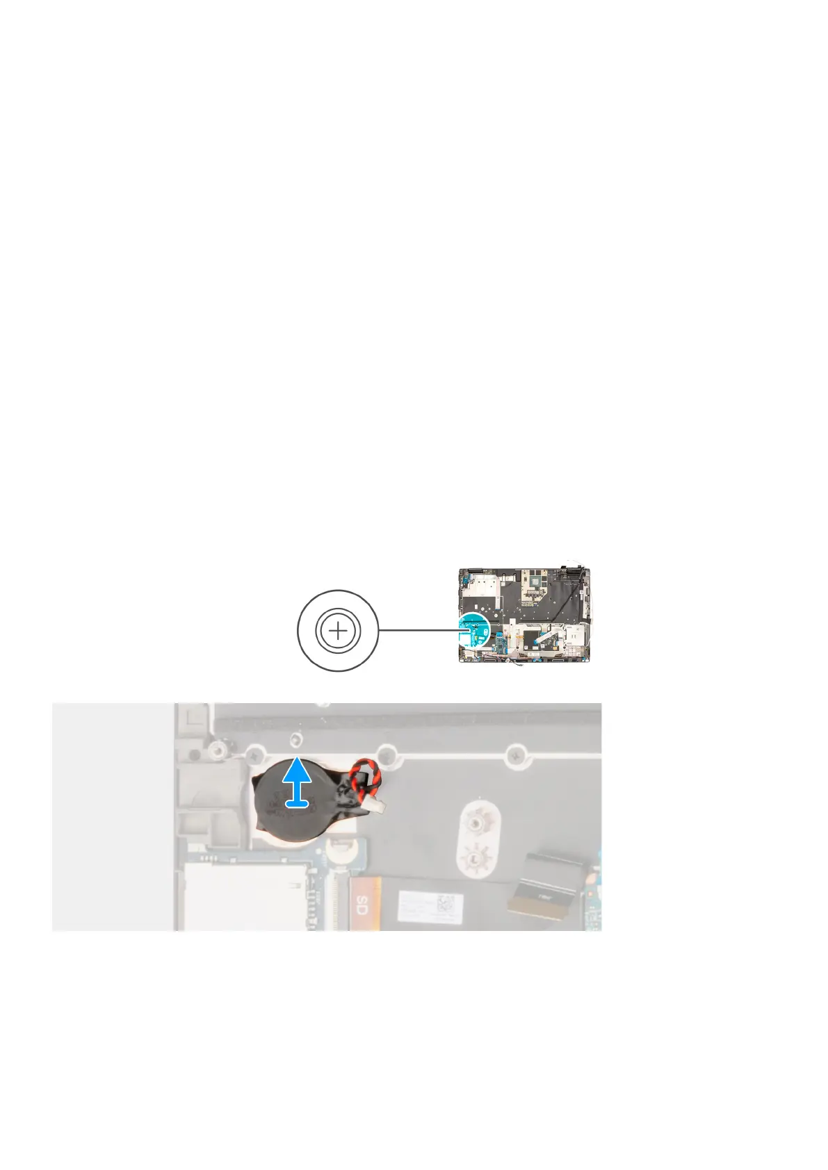 The figure indicates the location of the coin-cell battery and provides a visual representation of the removal procedure.
