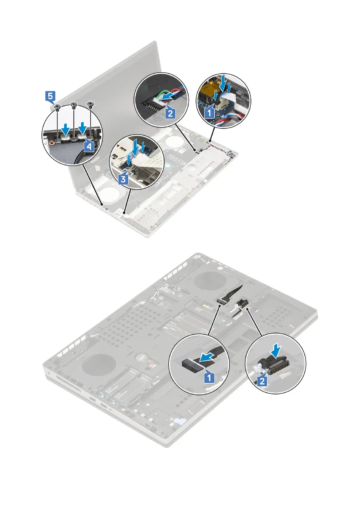 f. Connect the power connector cable and battery cable to the connectors on the system board [1, 2].