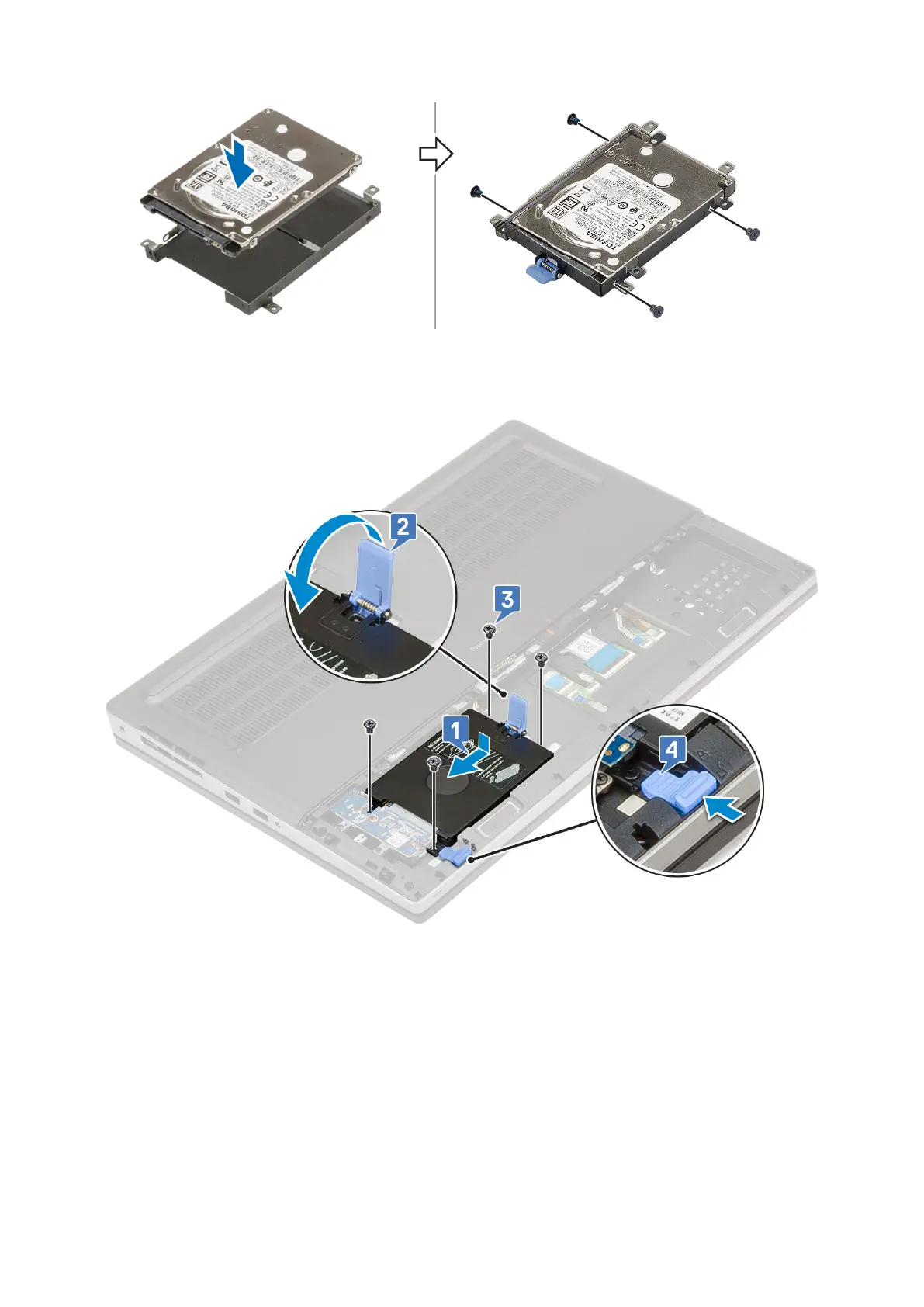 d. Replace the 4 (M2.5x3.0) screws to secure the hard drive assembly to the system [3].