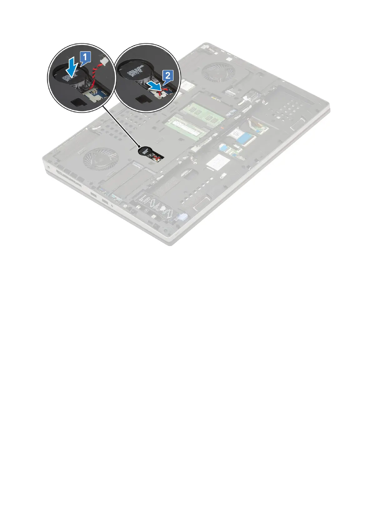 b. Peel the adhesive tape that secures the power connector cable to the system and unroute the cable [2, 3].
