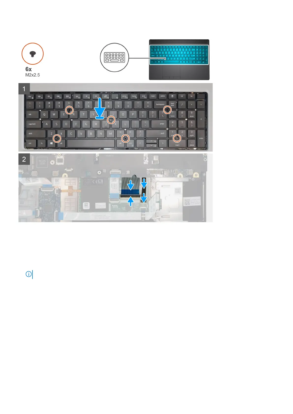 3. Replace the six (M2x2.5) screws to secure the keyboard to the palmrest.