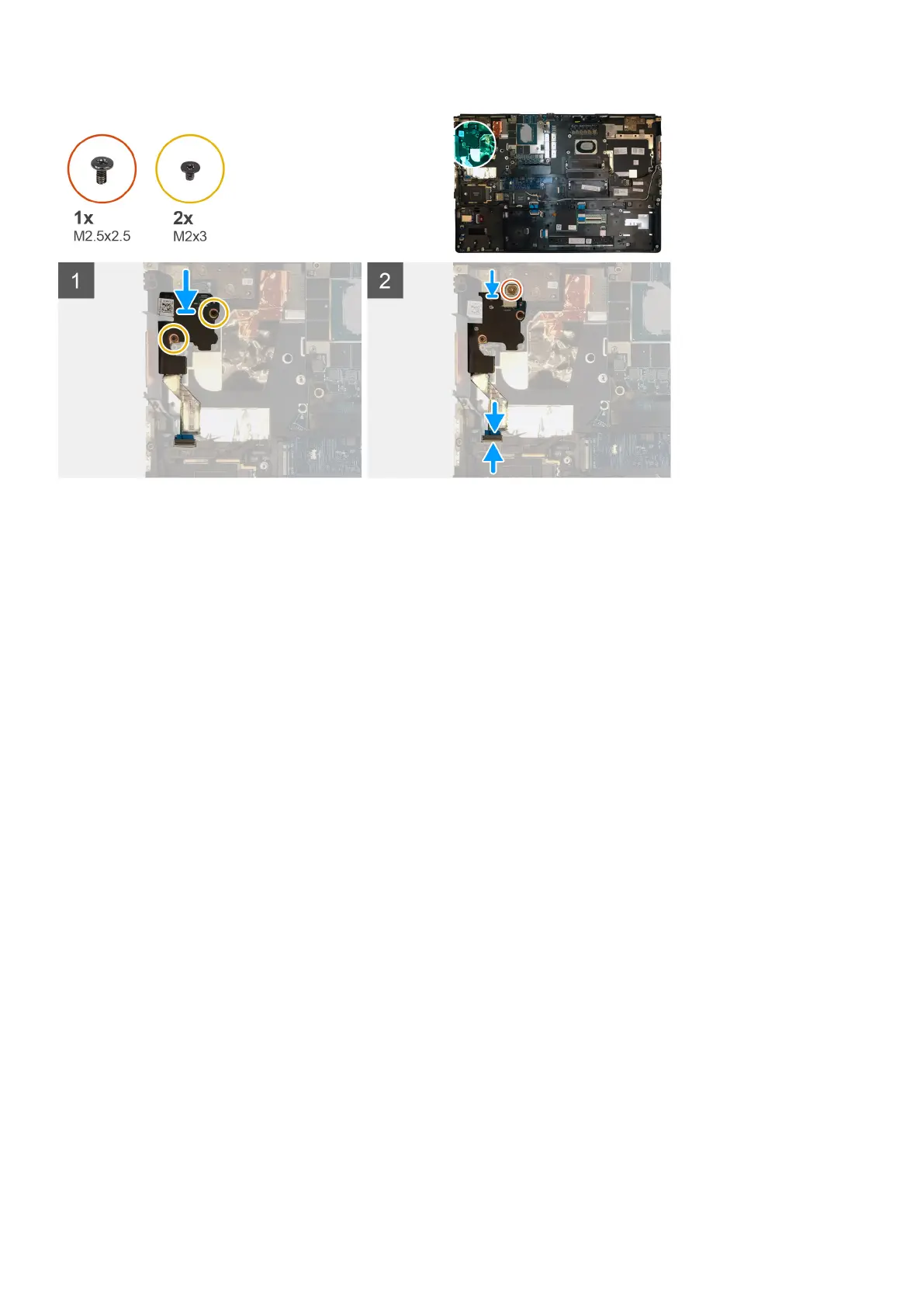 8. Replace the (M2.5x2.5) screw to secure the power button assembly with fingerprint reader cable bracket in place.