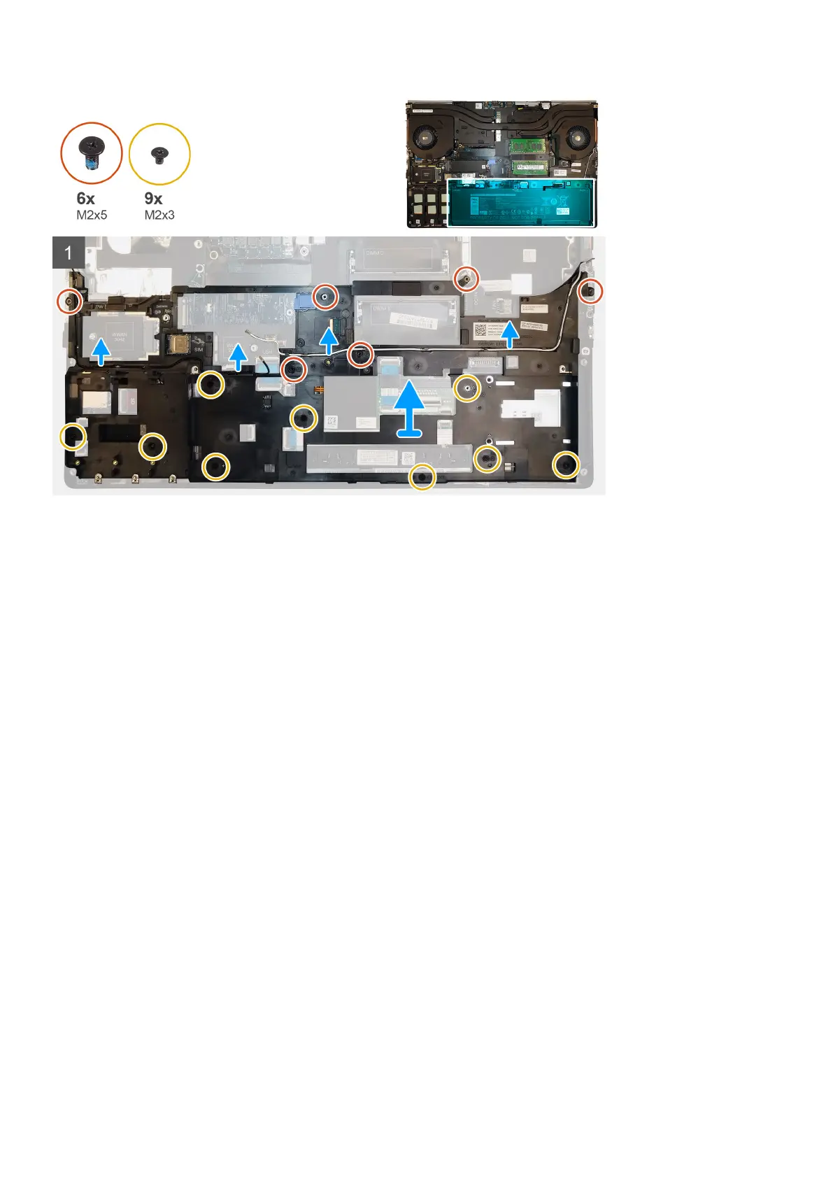 3. Remove the six (M2x5) and the nine (M2x3) screws that secure the inner frame to the computer chassis.