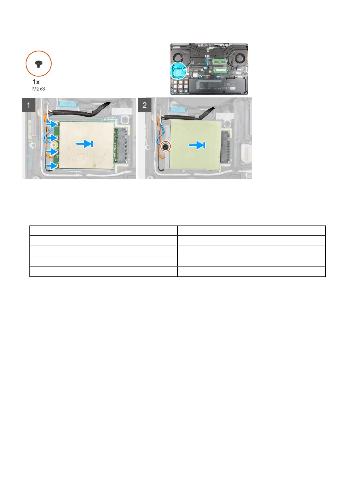 1. Connect the antenna cables to the connectors on the WWAN card. The following table provides the antenna-cable color