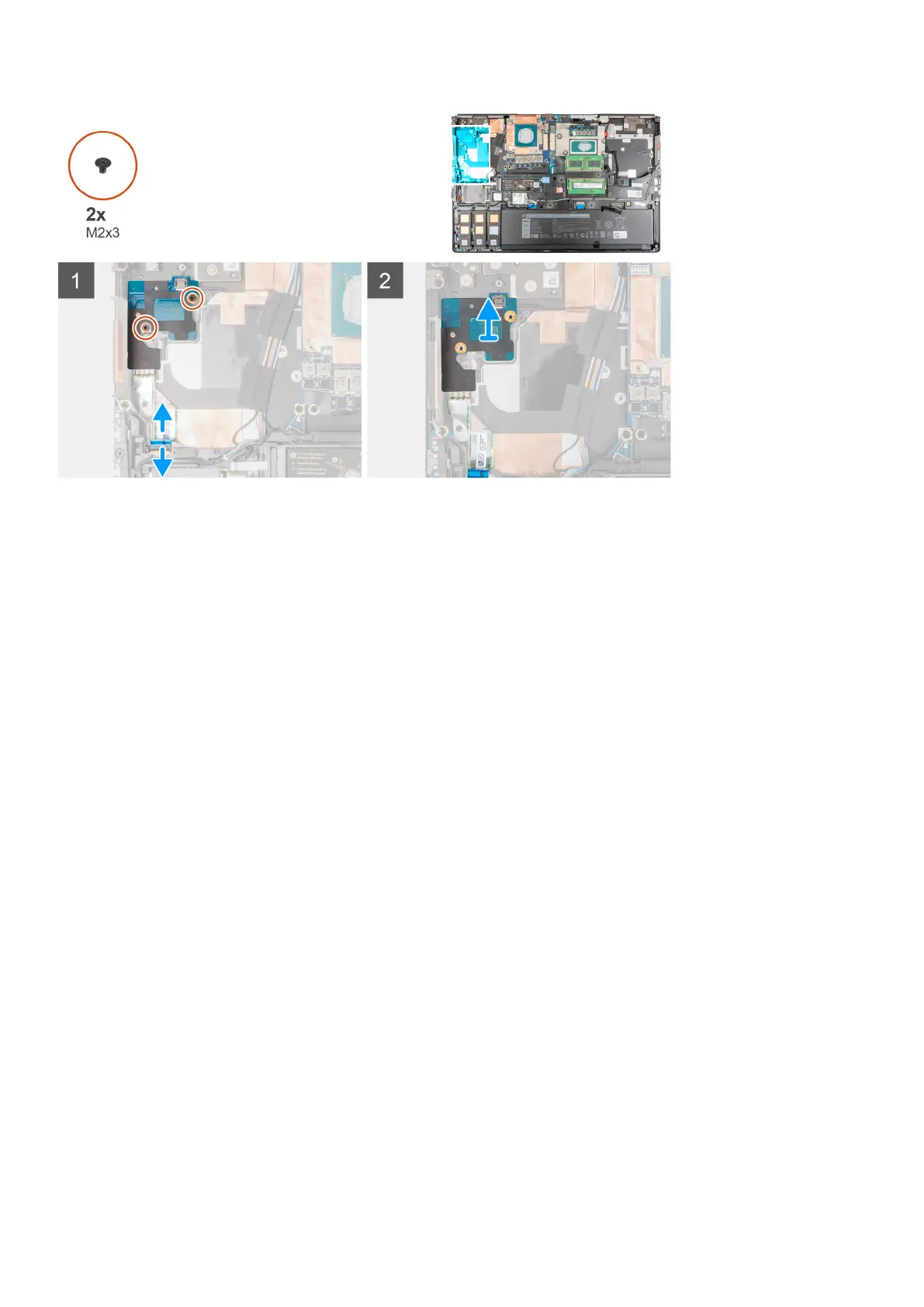 3. Remove the two (M2x3) screws that secure the power button board to the computer.