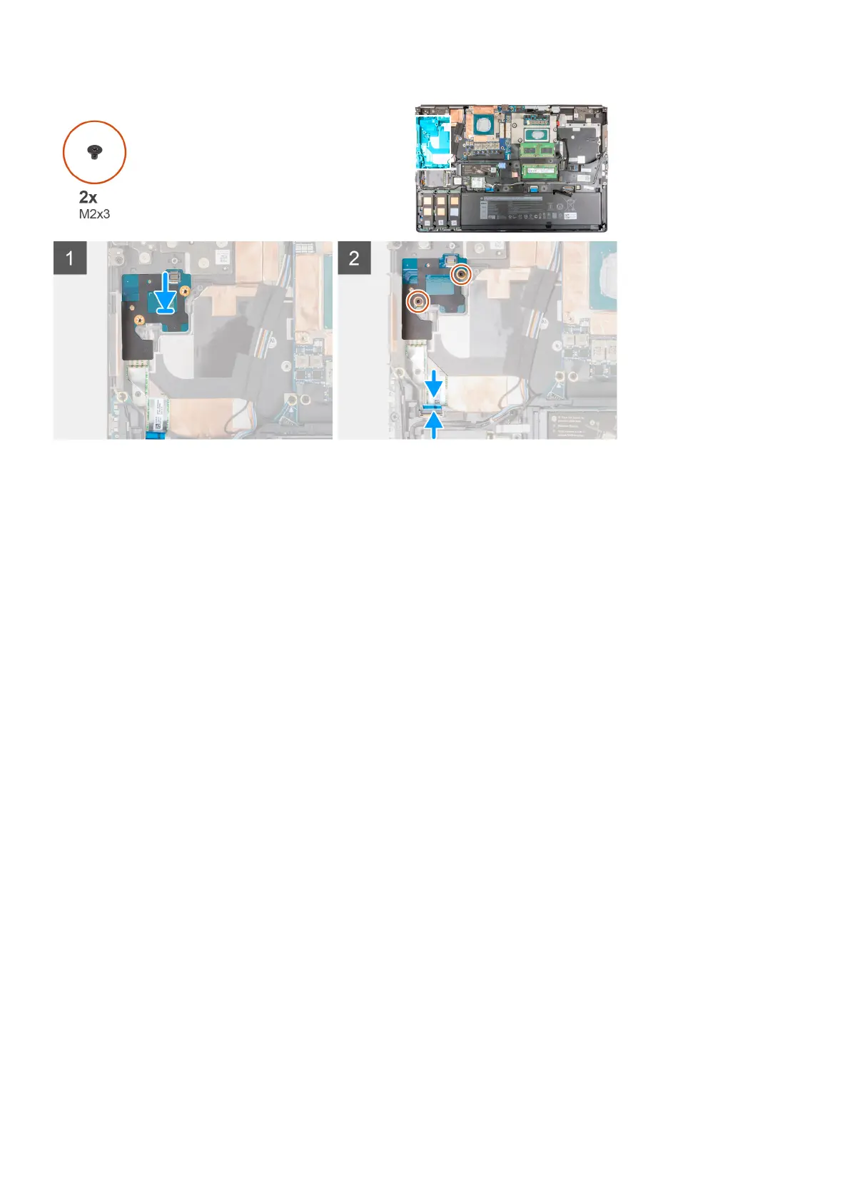 3. Replace the two (M2x3) screws to secure the power button board to the computer.