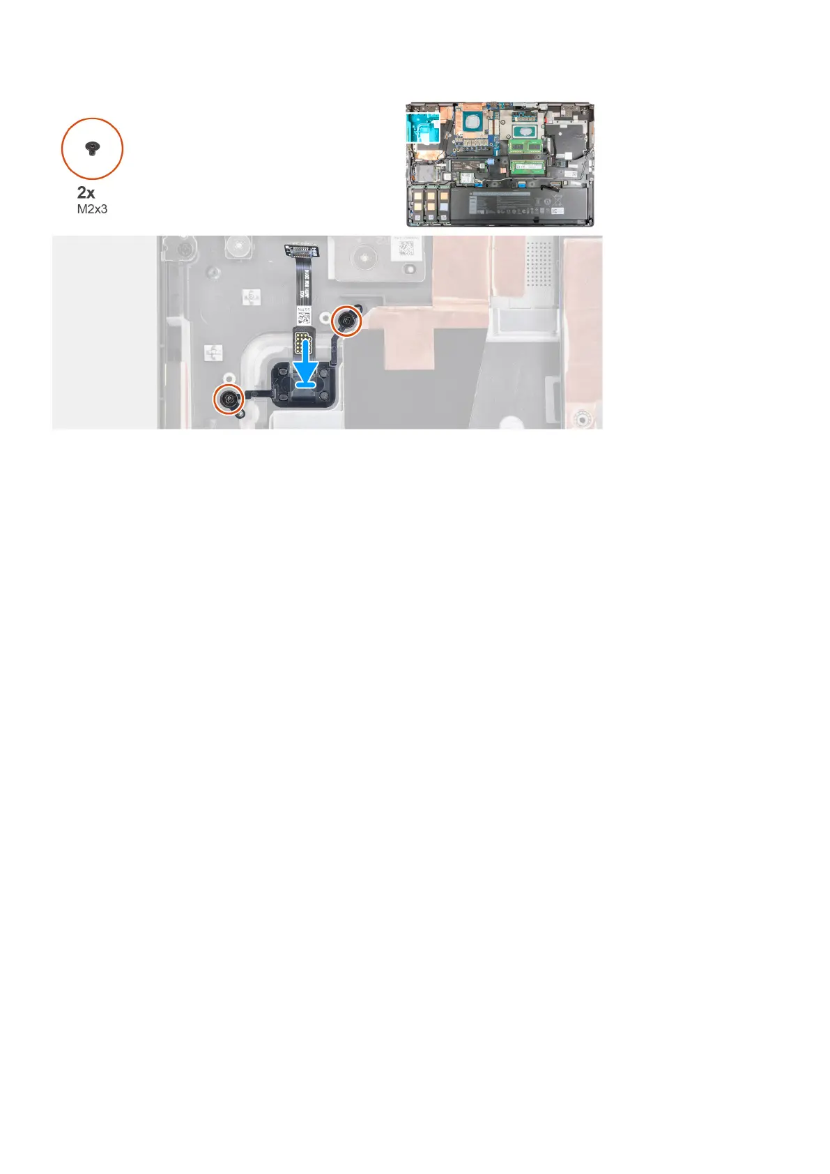 2. Replace the two (M2x3) screws to secure the power button assembly with fingerprint reader in place.