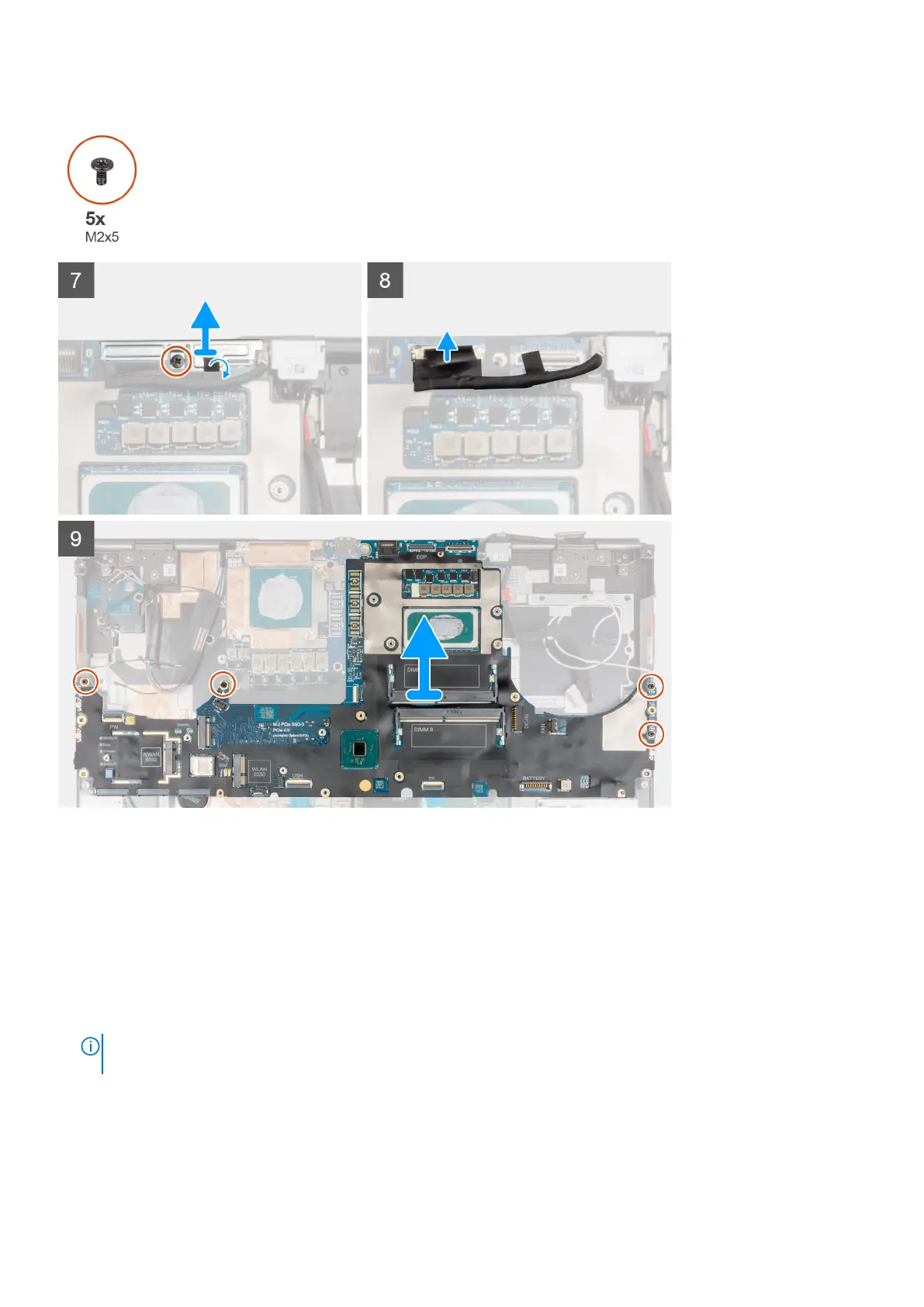 10. Remove the four (M2x5) screws that secure the system board to the computer.