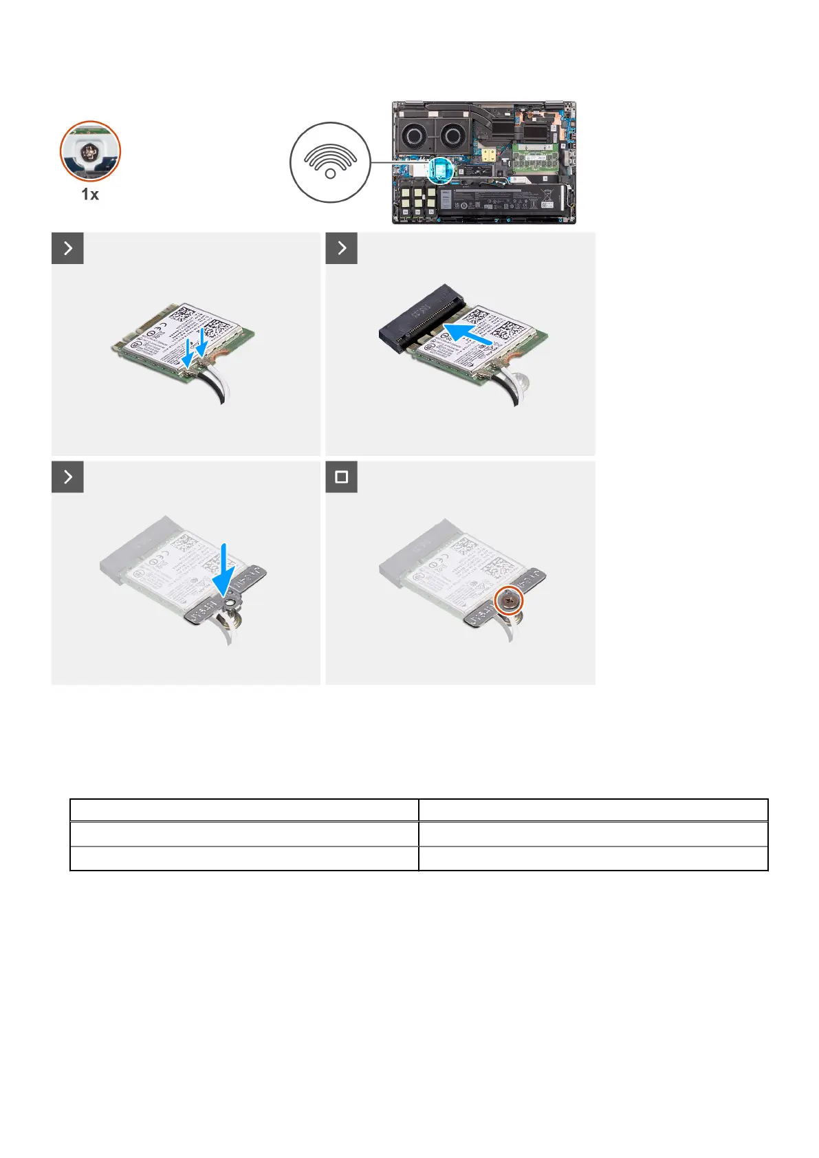 The following table provides the antenna-cable color scheme for the WLAN card of your computer.
