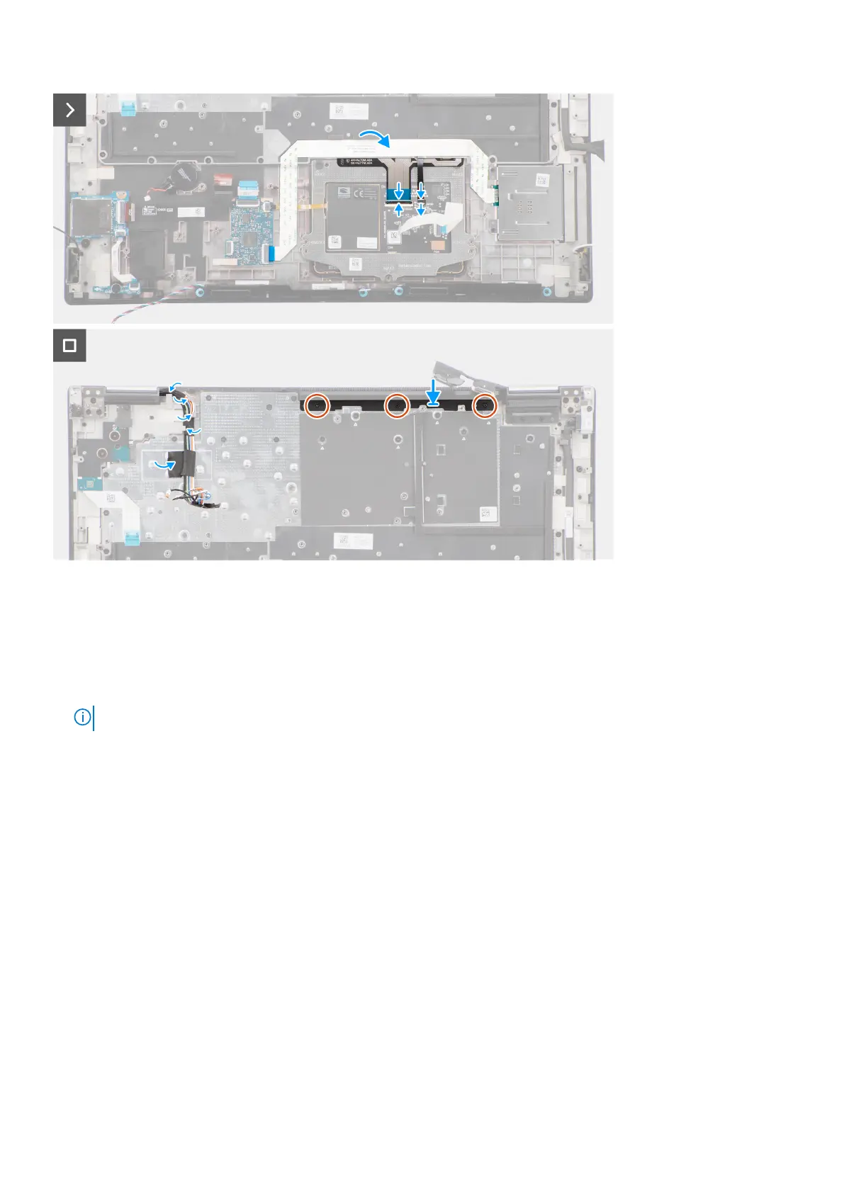 5. Lift the latch and connect the keyboard FPC and the keyboard backlight FPC to their connectors on the touchpad module.