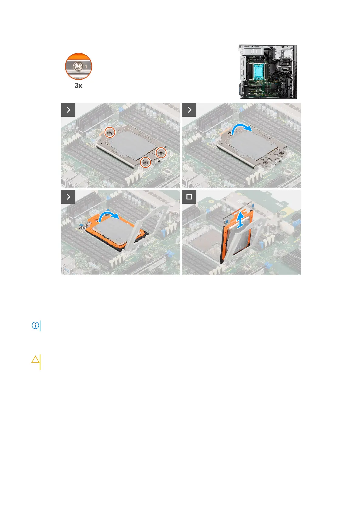 3. Lift the CPU carrier by holding the two blue latch points on the rail frame and rotating it to the vertical position.