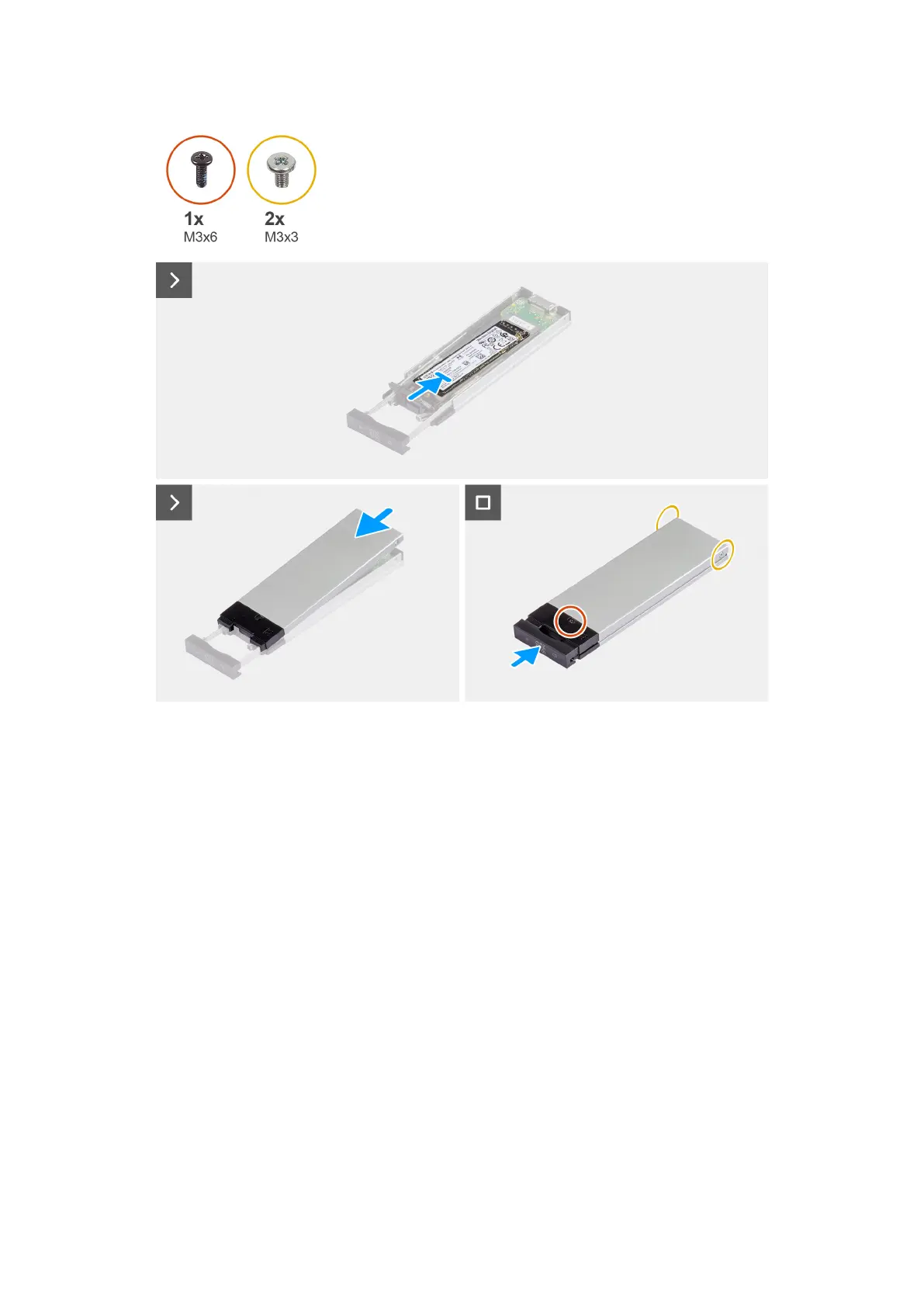 4. Install the single (M3x6) screw and the two (M3x3) screws to secure the cover to the solid-state drive assembly.