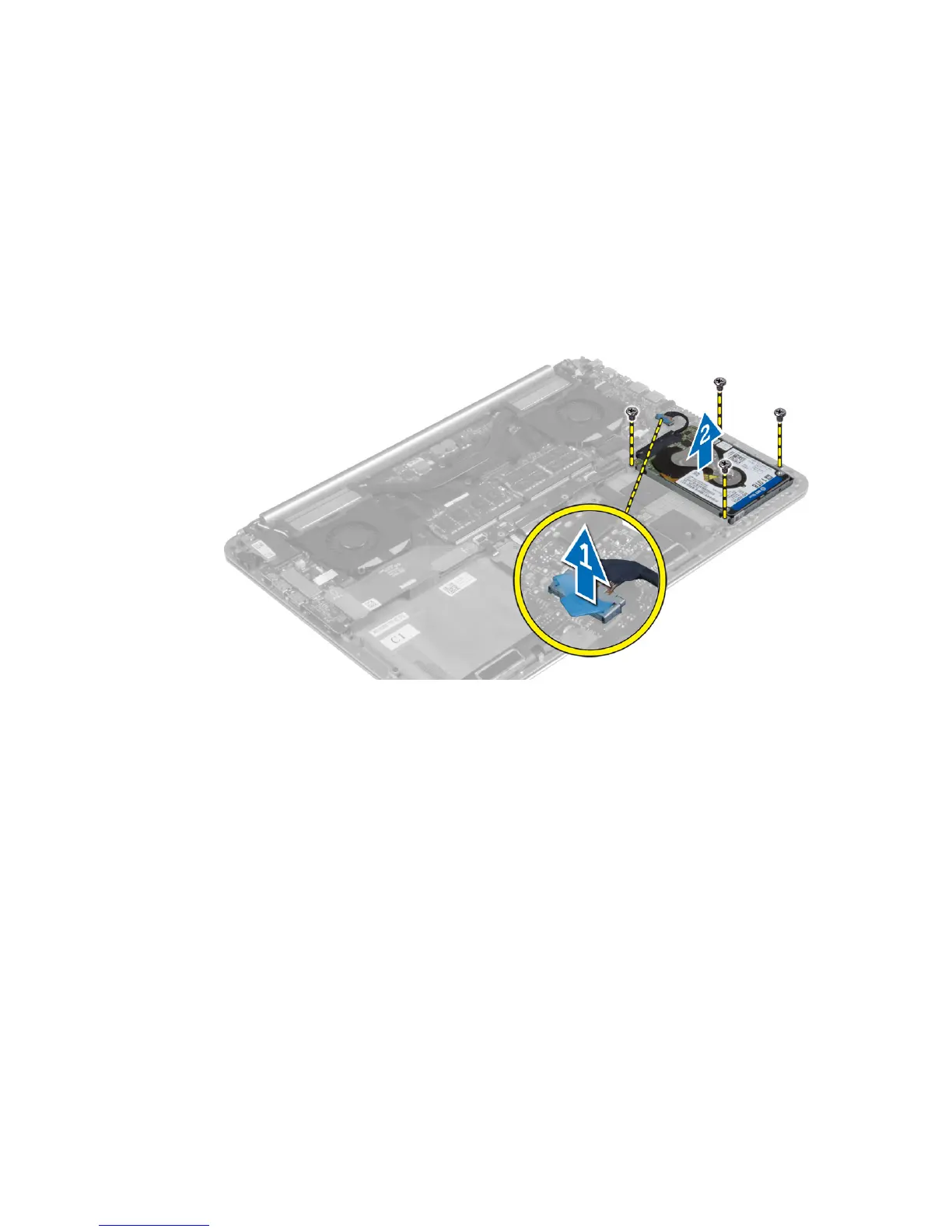 b) Remove the screws that secure the hard drive to the palmrest assembly.