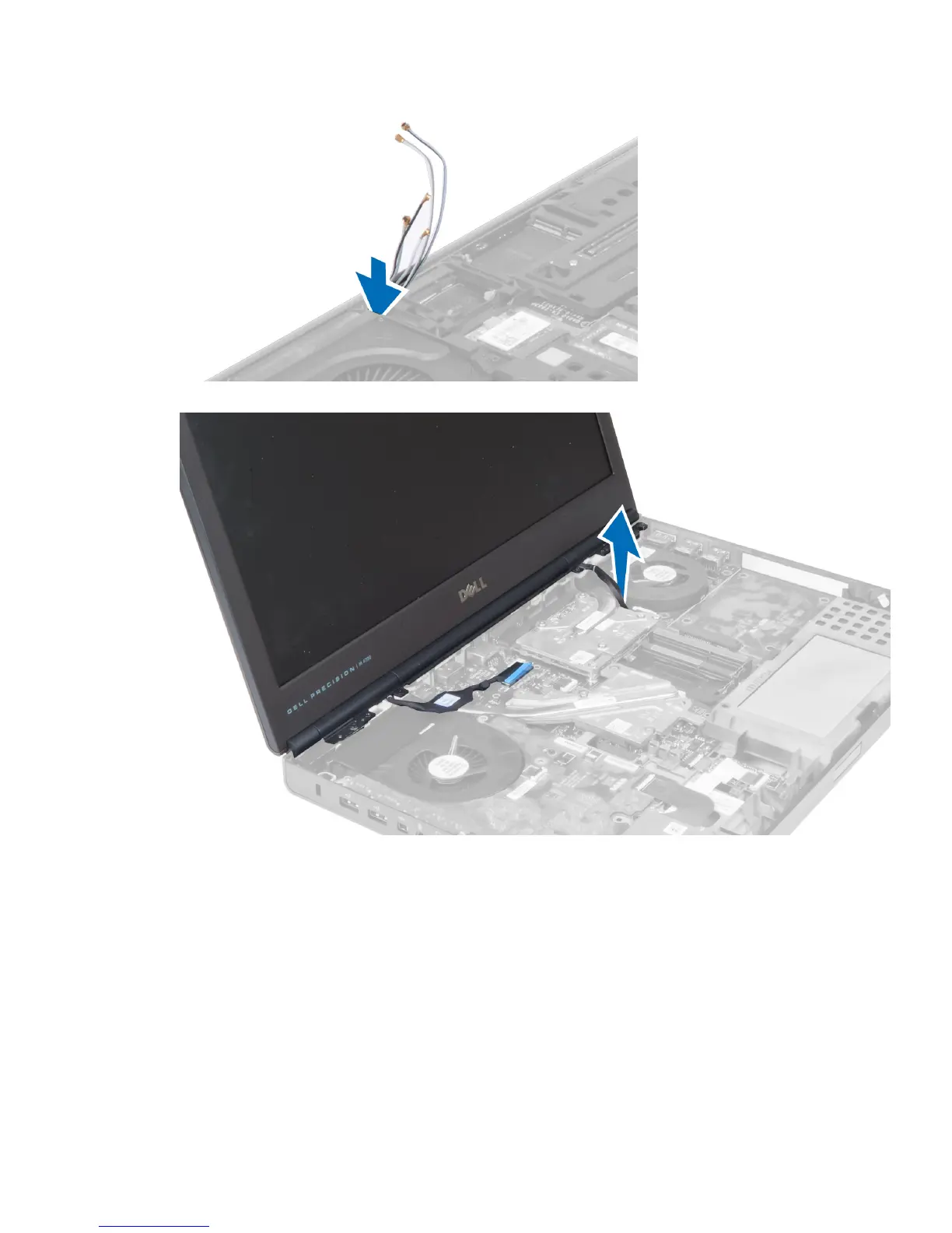 4. Flip the computer and pull up the antenna cables through the routing hole.