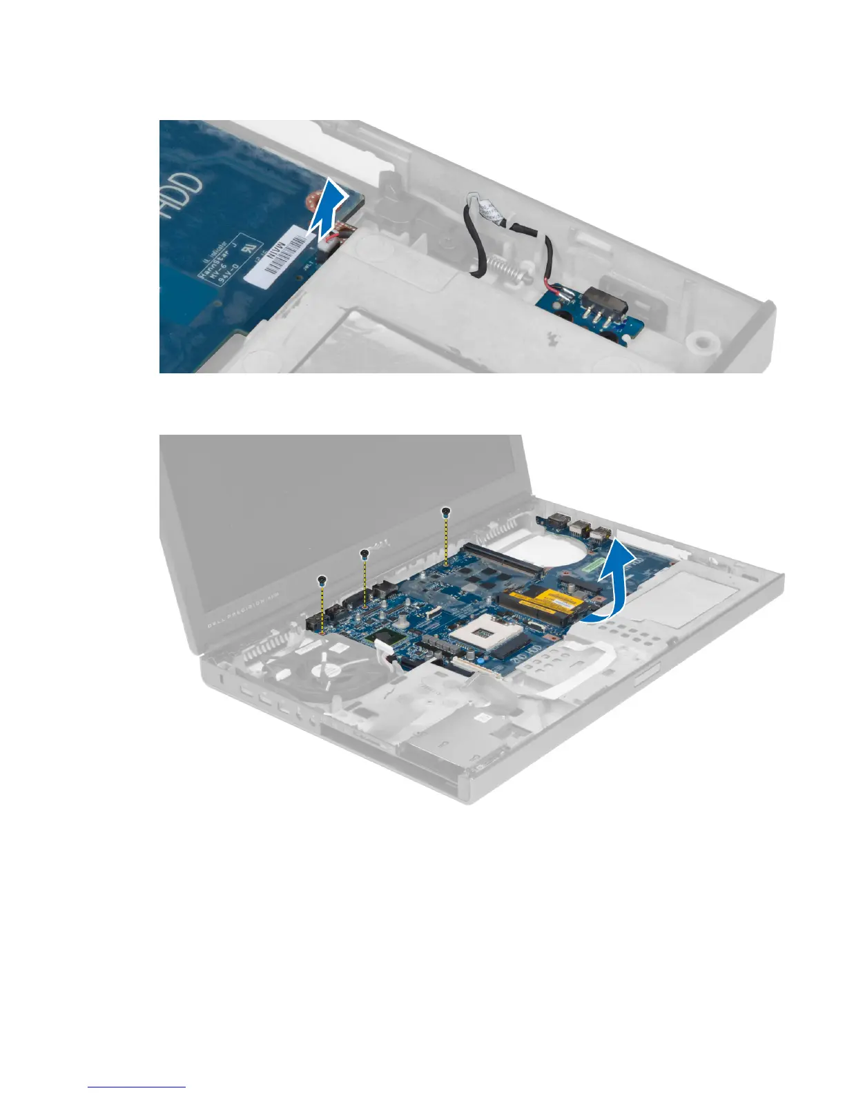 8. Remove the screws that secure the system board to the computer and lift the bottom edge of the system board at a