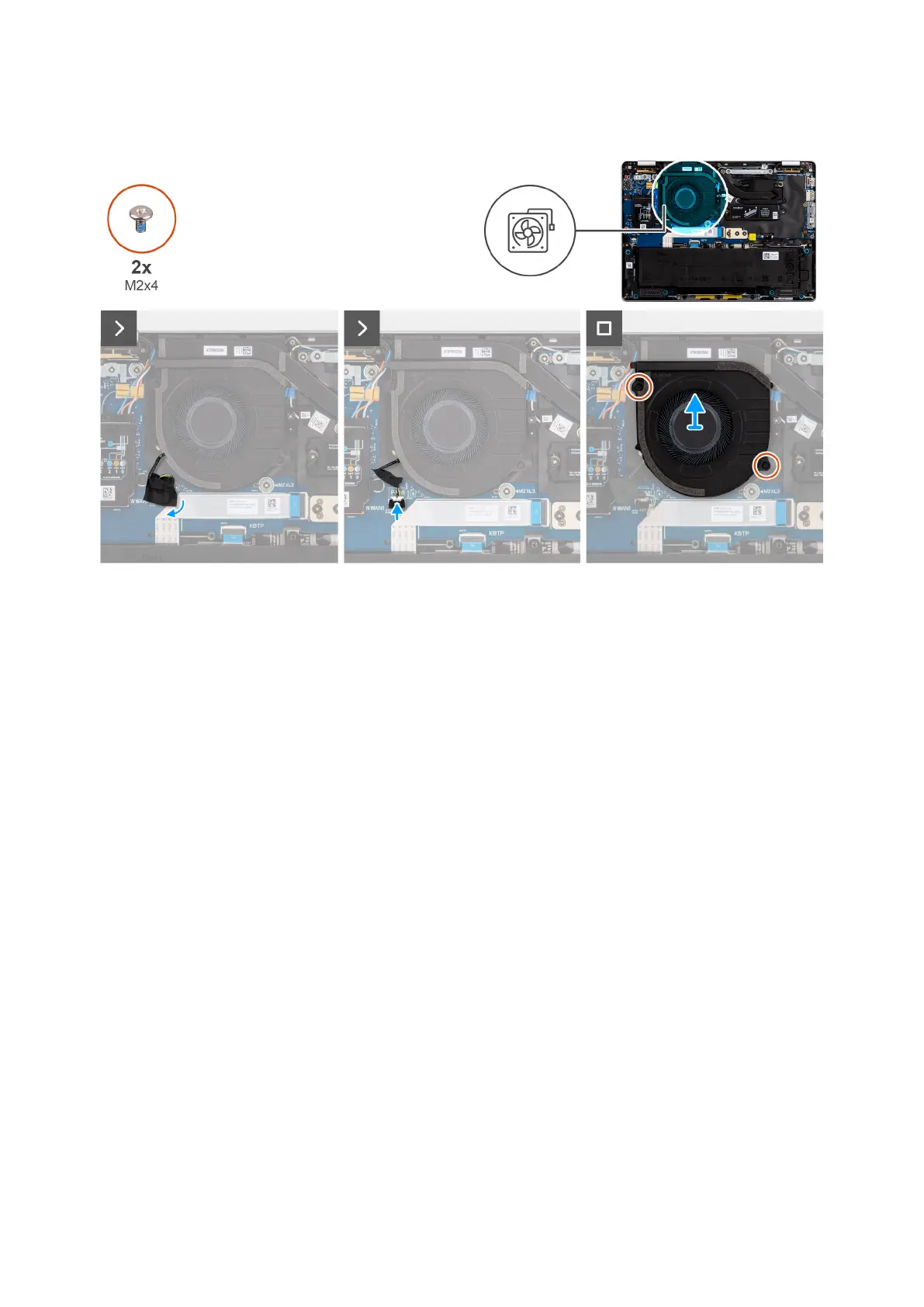 3. Remove the two screws (M2x3) that secure the fan to the palm-rest assembly.