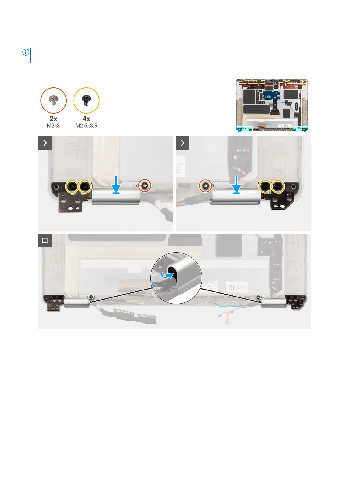 3. Replace the two screws (M2x3) and four screws (M2.5x3.5) that secure the display hinge cap and hinge assembly in place.