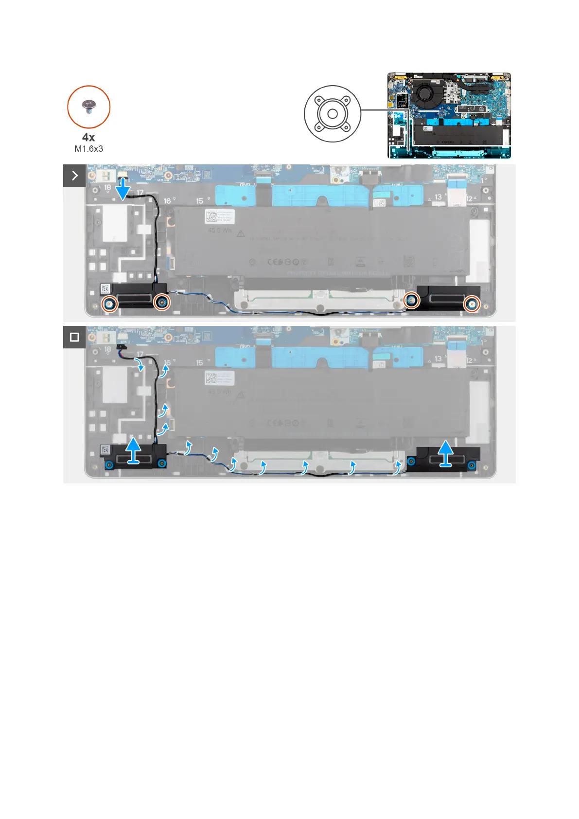 1. Remove the four screw (M1.6x3) that secures the speakers to the palm-rest assembly.