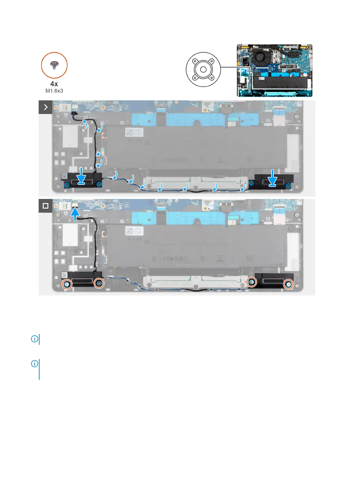 3. Replace the four screws (M1.6x3) that secure the speakers to the palm-rest assembly.