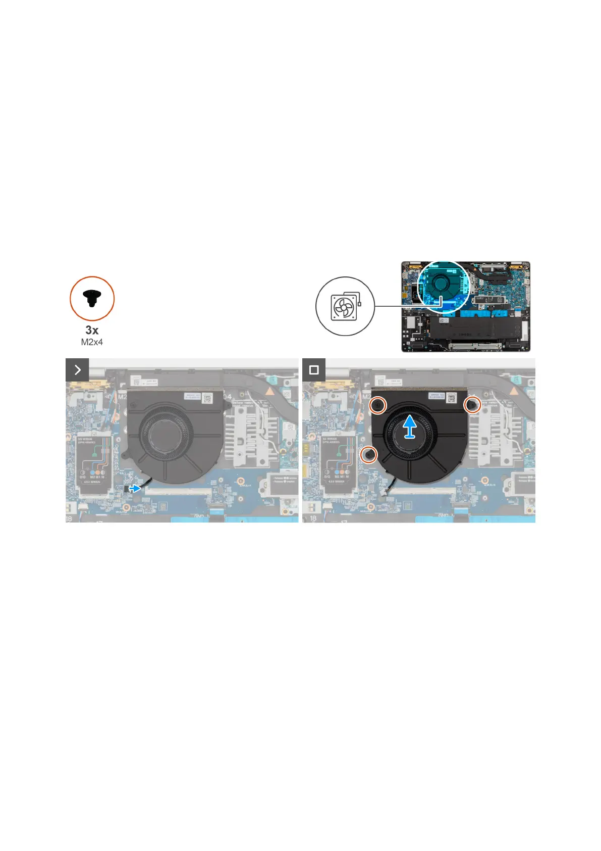 3. Remove the three screws (M2x4) that secure the fan to the palm-rest assembly.