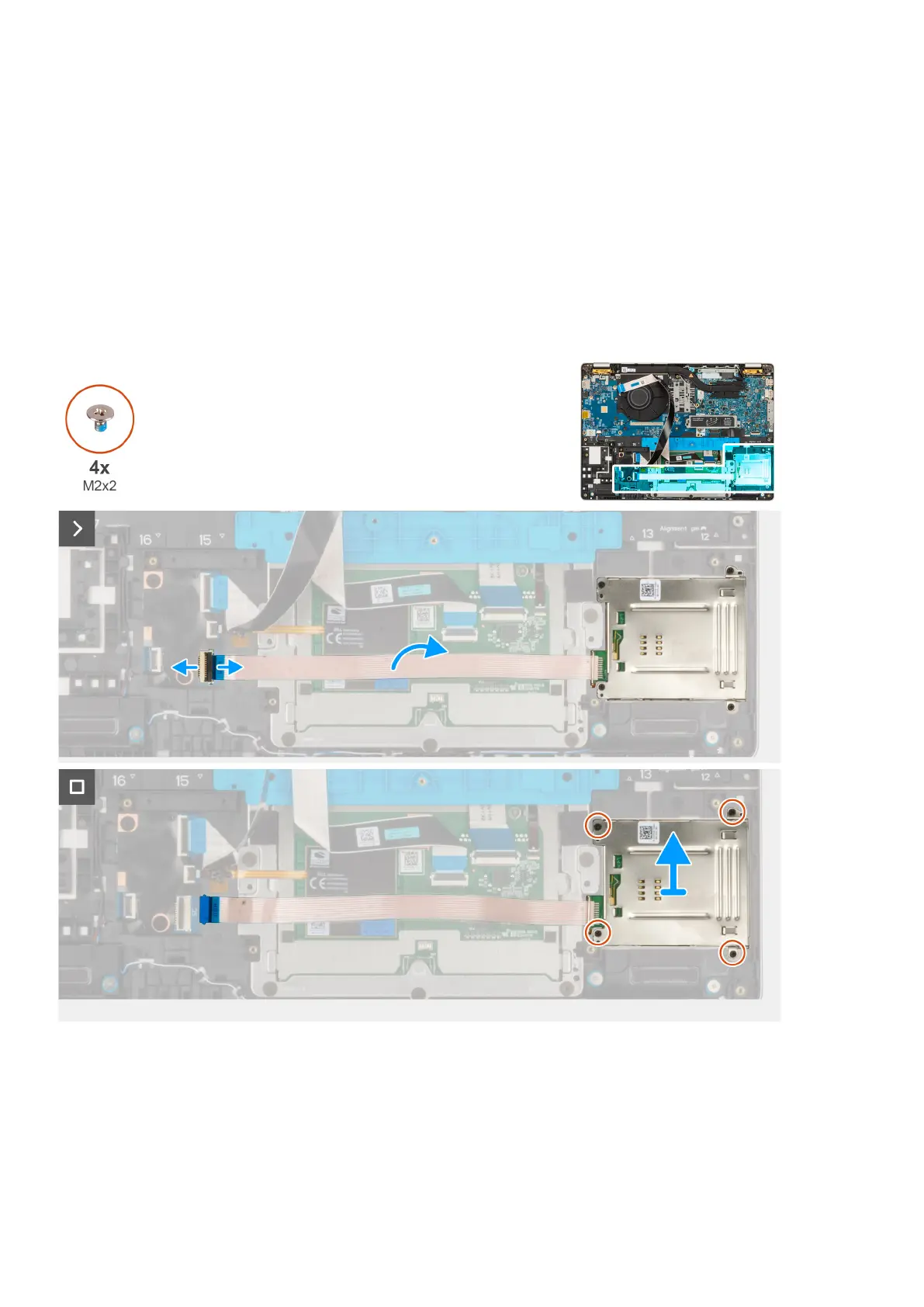 2. Remove the four screws (M2x2) that secure the smart-card reader to the palm-rest assembly.