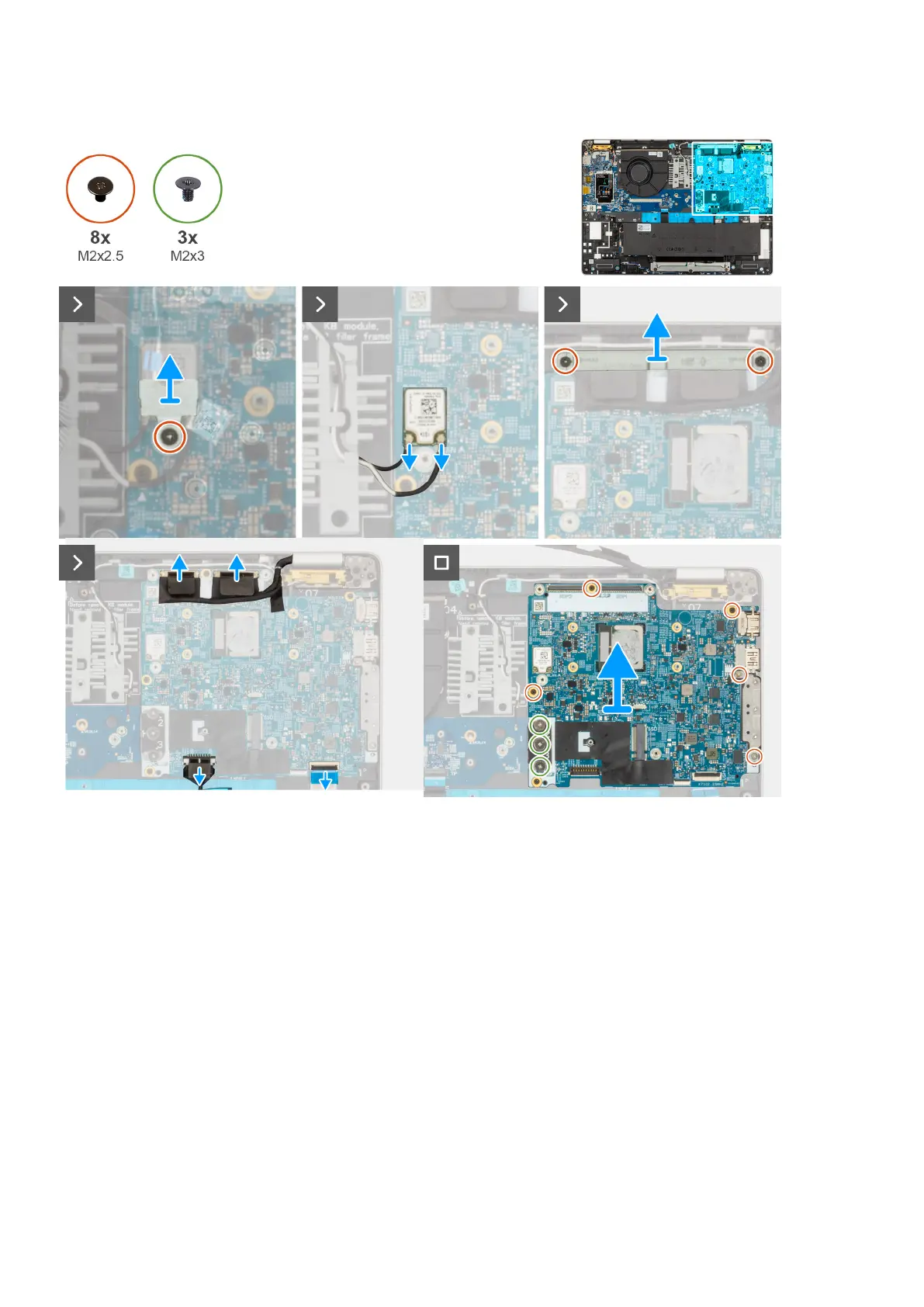 14. Remove the five screws (M2x4) that secure the system board to the palm-rest assembly.