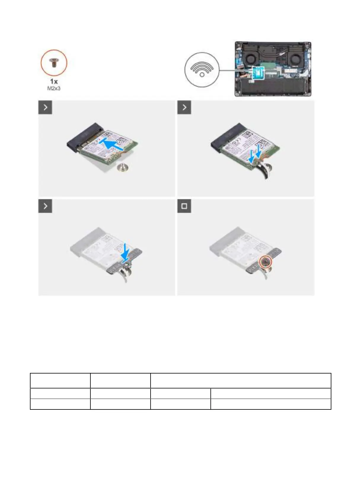 6. Replace the screw (M2x3) to secure the wireless-card bracket and the wireless card to the system board.