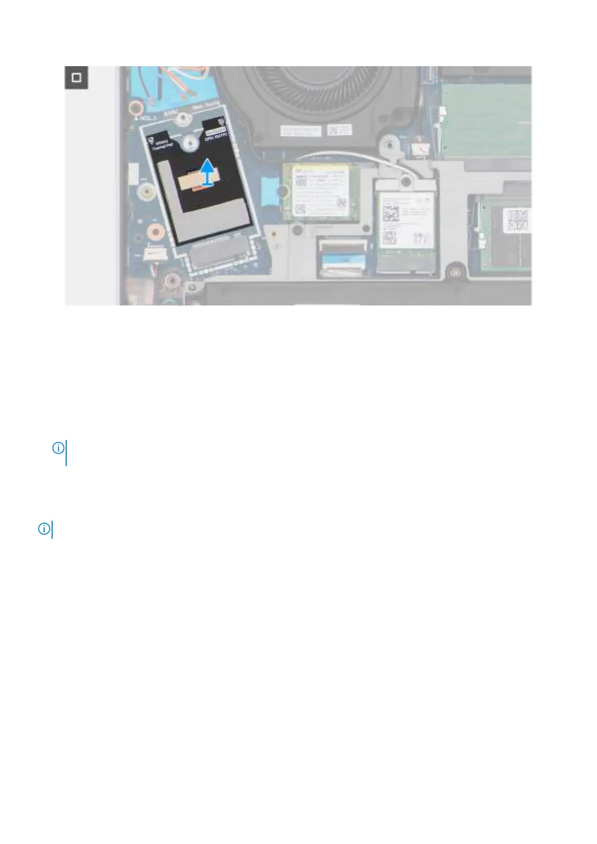 6. Slide and remove the WWAN module from the WWAN-module slot (WWAN1) on the system board.