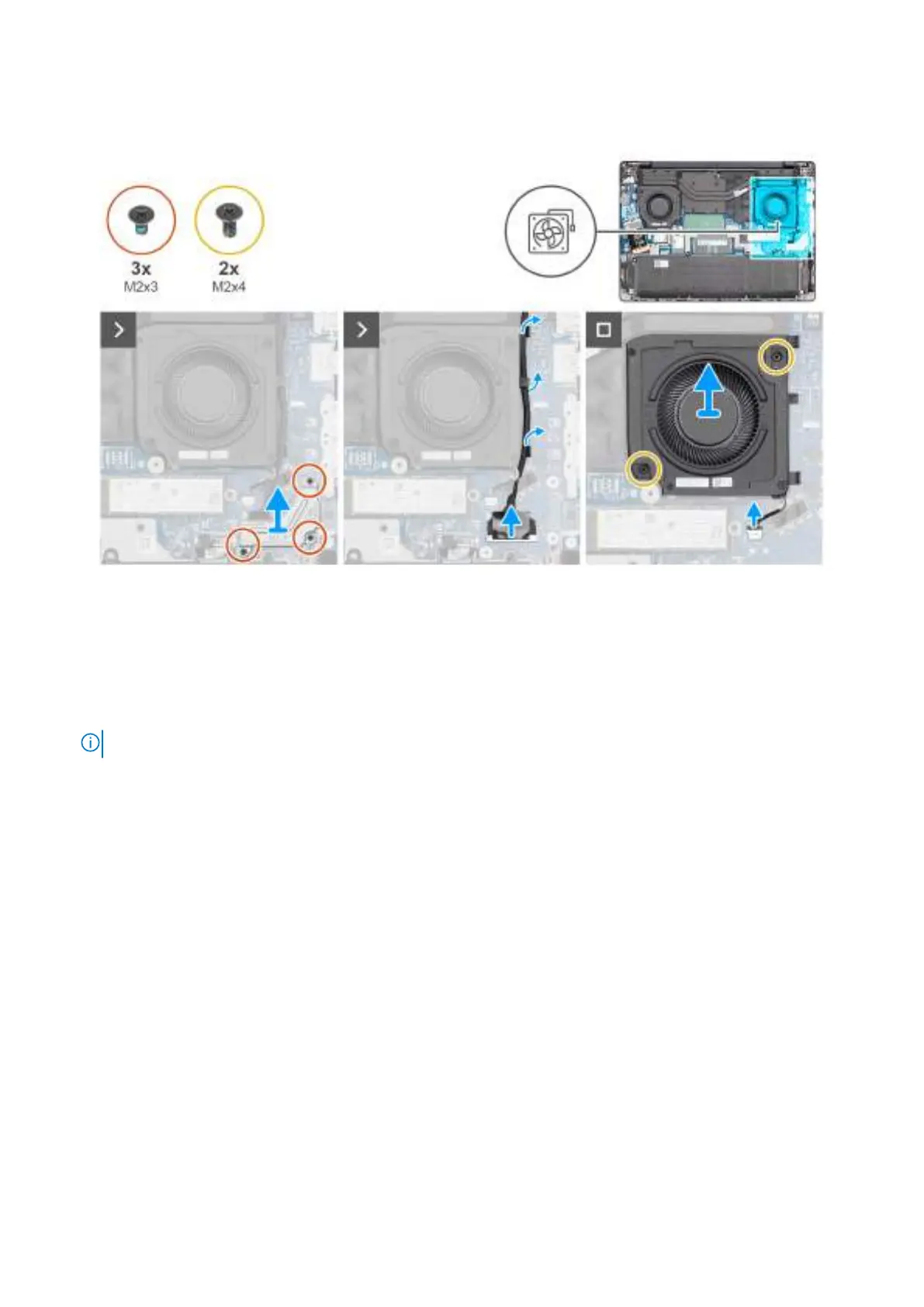 7. Remove the two screws (M2x4) that secure the fan to the palm-rest assembly.