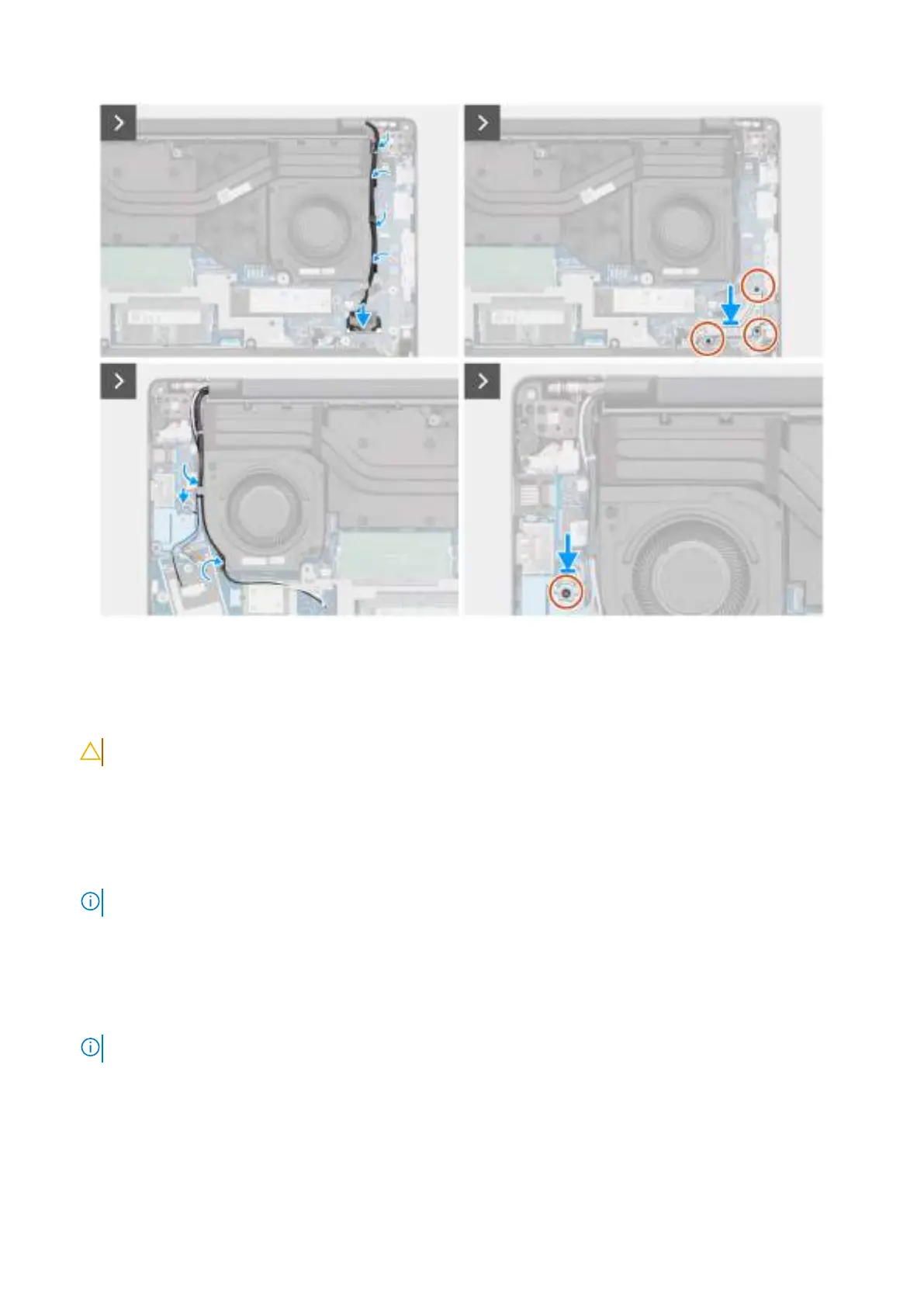10. Route the wireless-antenna cables and WWAN-antenna cables, if available, through the routing guides on the right/