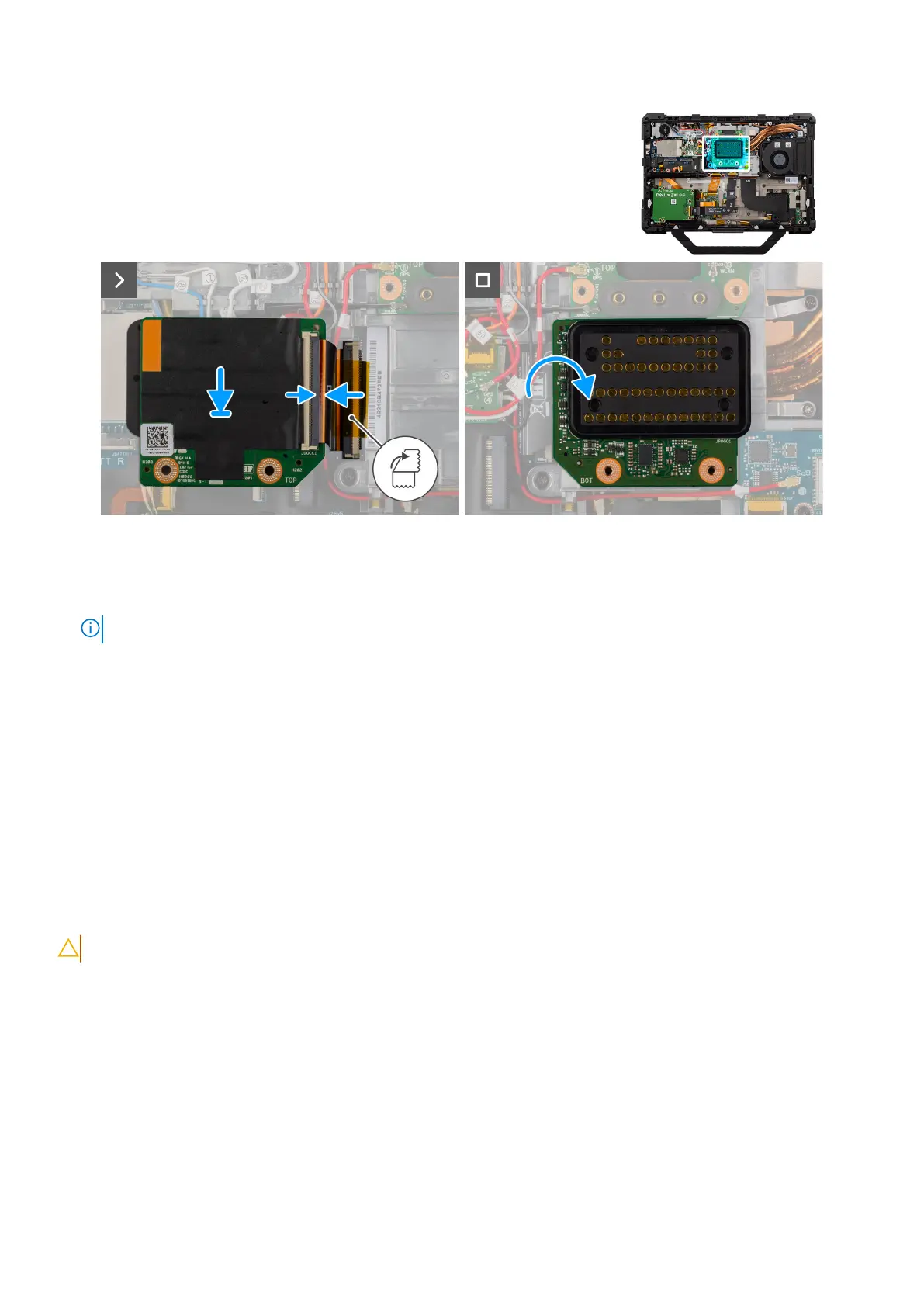 1. Place the dock I/O-module and connect the dock I/O flexible printed cable to the system board.