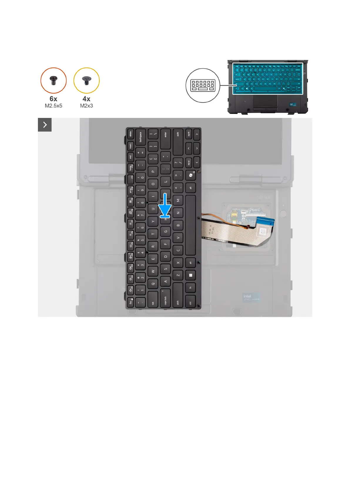 The following images indicate the location of the keyboard and provide a visual representation of the installation procedure.