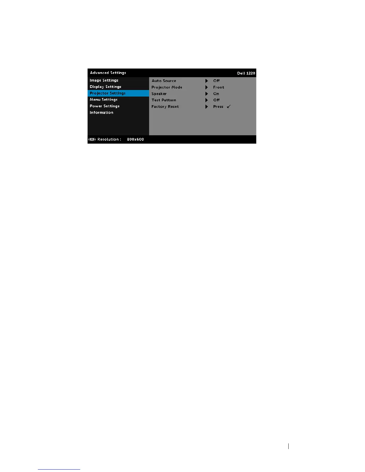 The projector settings menu provides the following options: