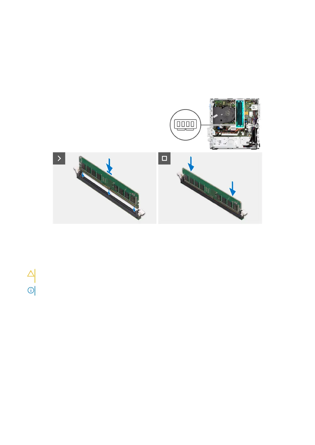 3. Premere il modulo di memoria fino a quando quest'ultimo non scatta in posizione e i fermagli di fissaggio si bloccano in