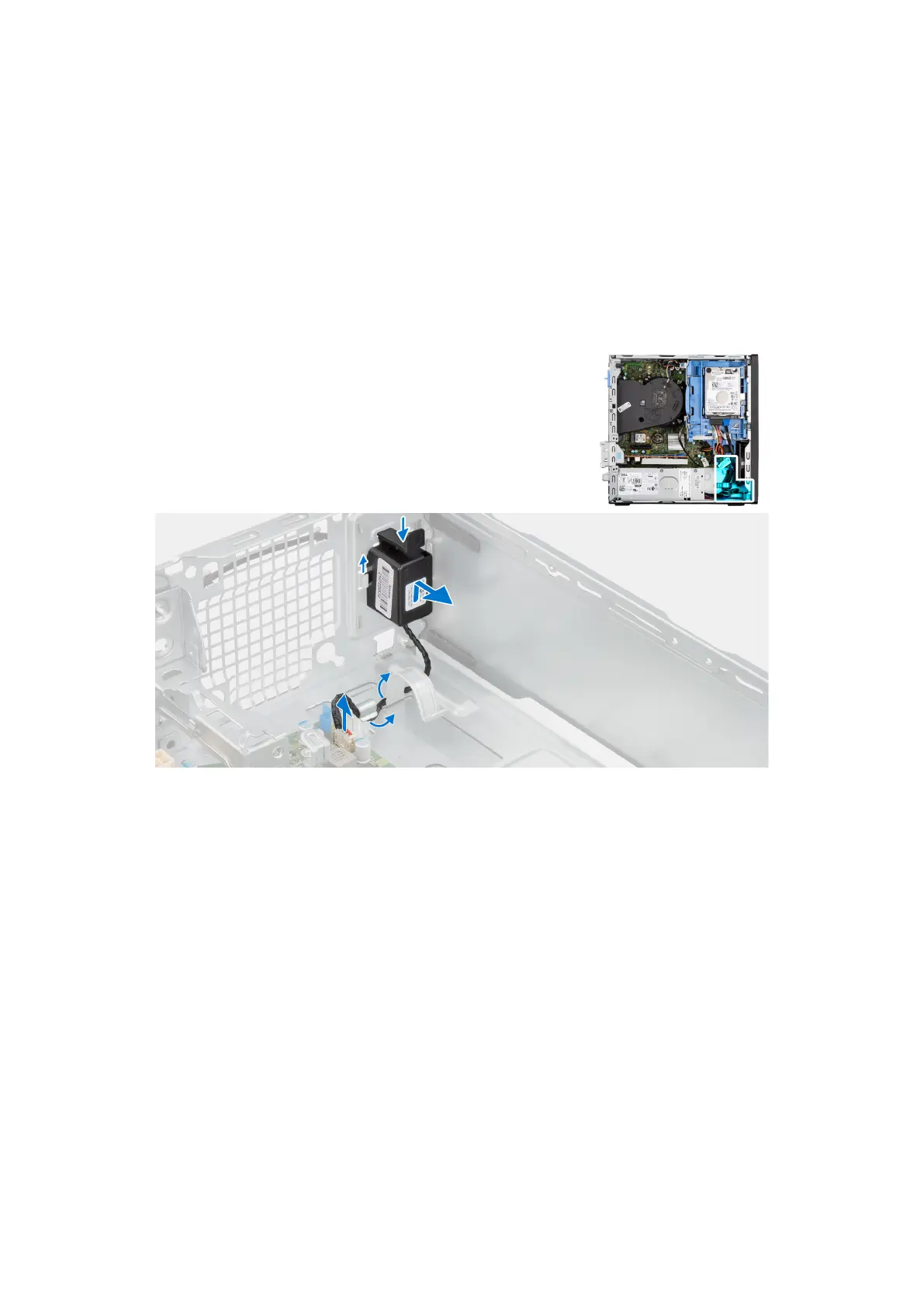 3. Premere la linguetta, sollevare e far scorrere l'altoparlante per rimuoverlo insieme al cavo dallo slot sullo chassis.