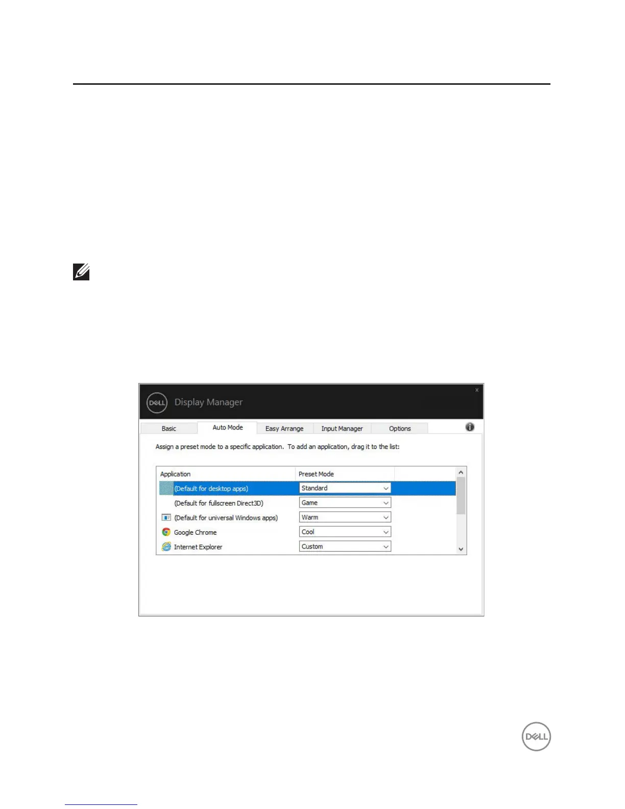 application, and apply it automatically. When Auto Mode is enabled, Dell Display