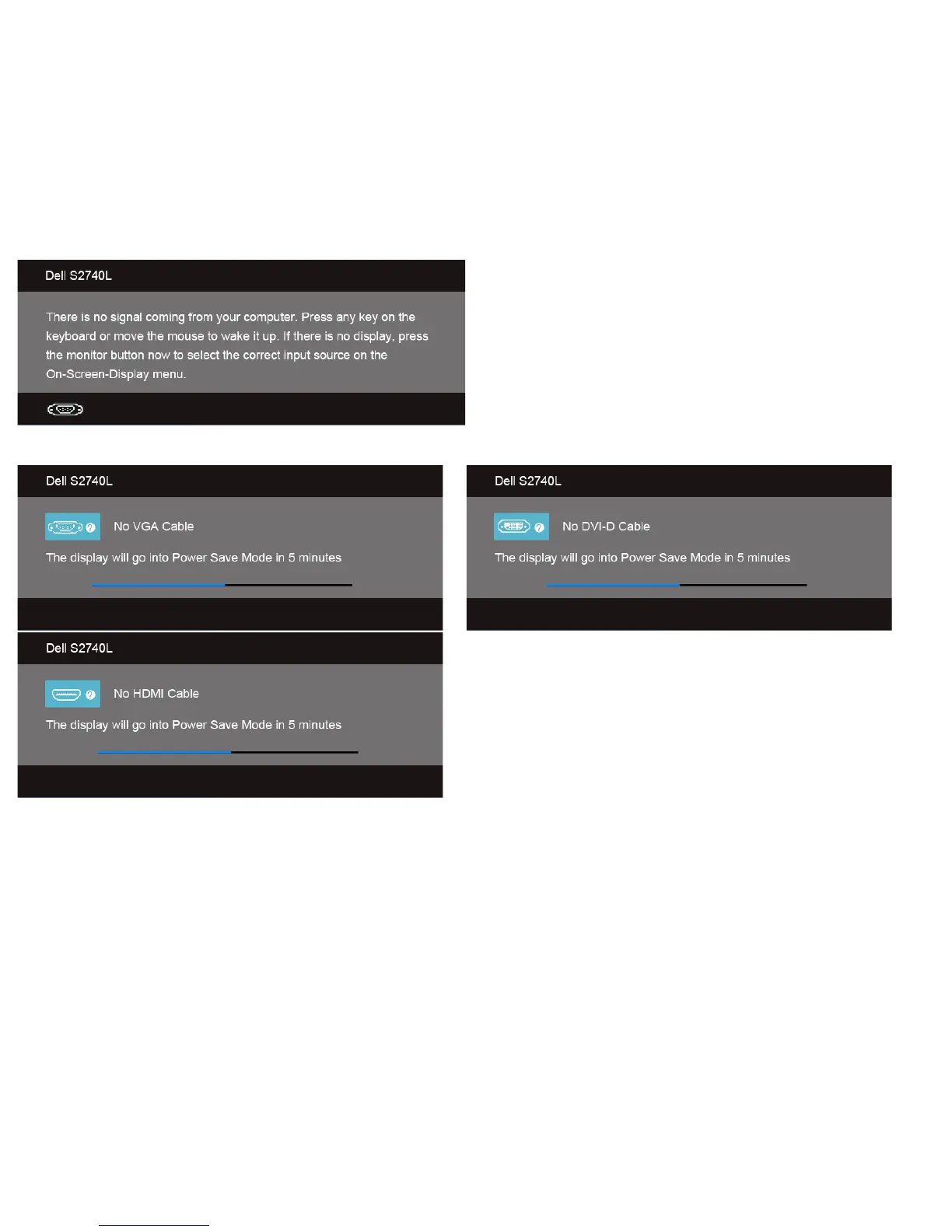 If either VGA, DVI-D, or HDMI input is selected and the corresponding cable is not connected, a floating dialog box as shown below appears.