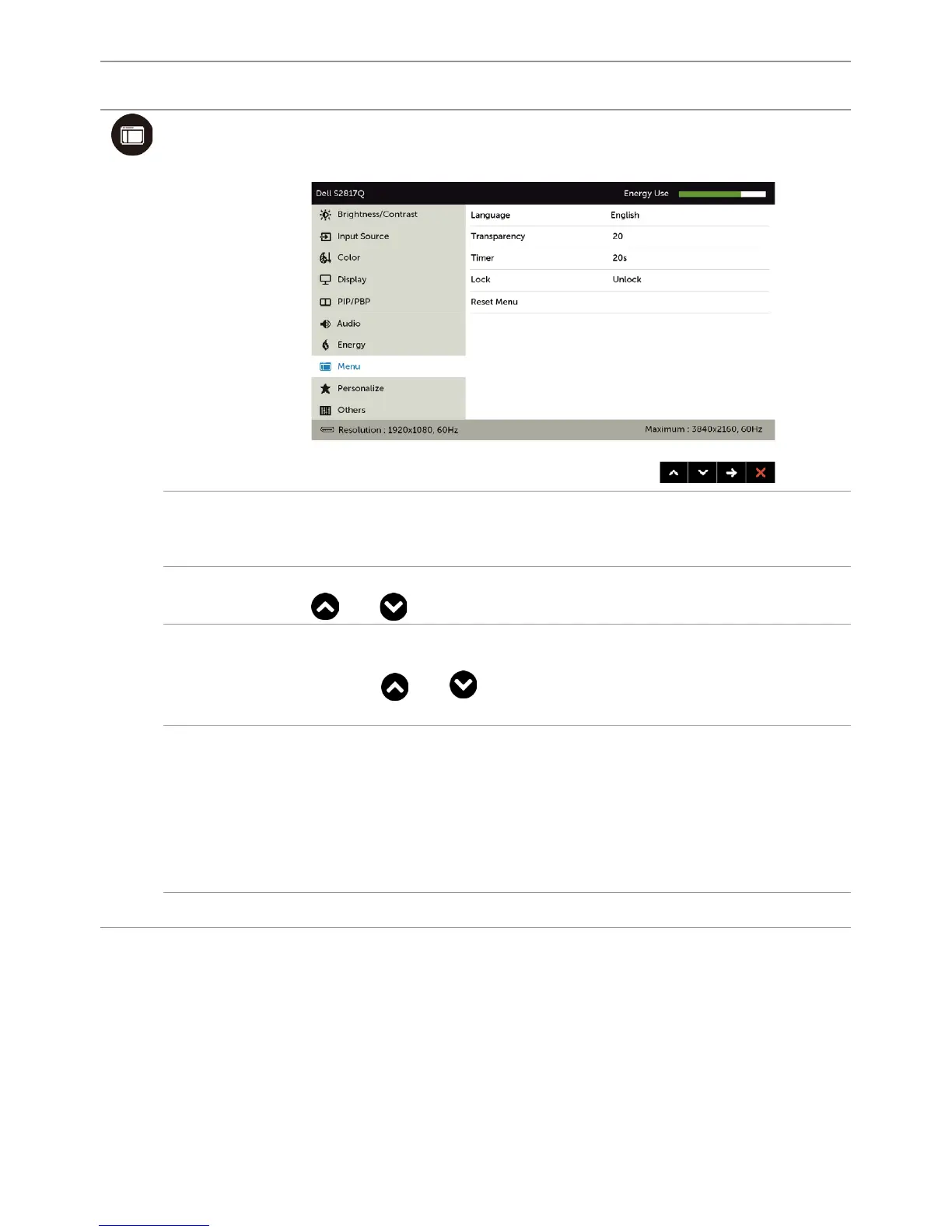 Menu Select this option to adjust the settings of the OSD, such as,