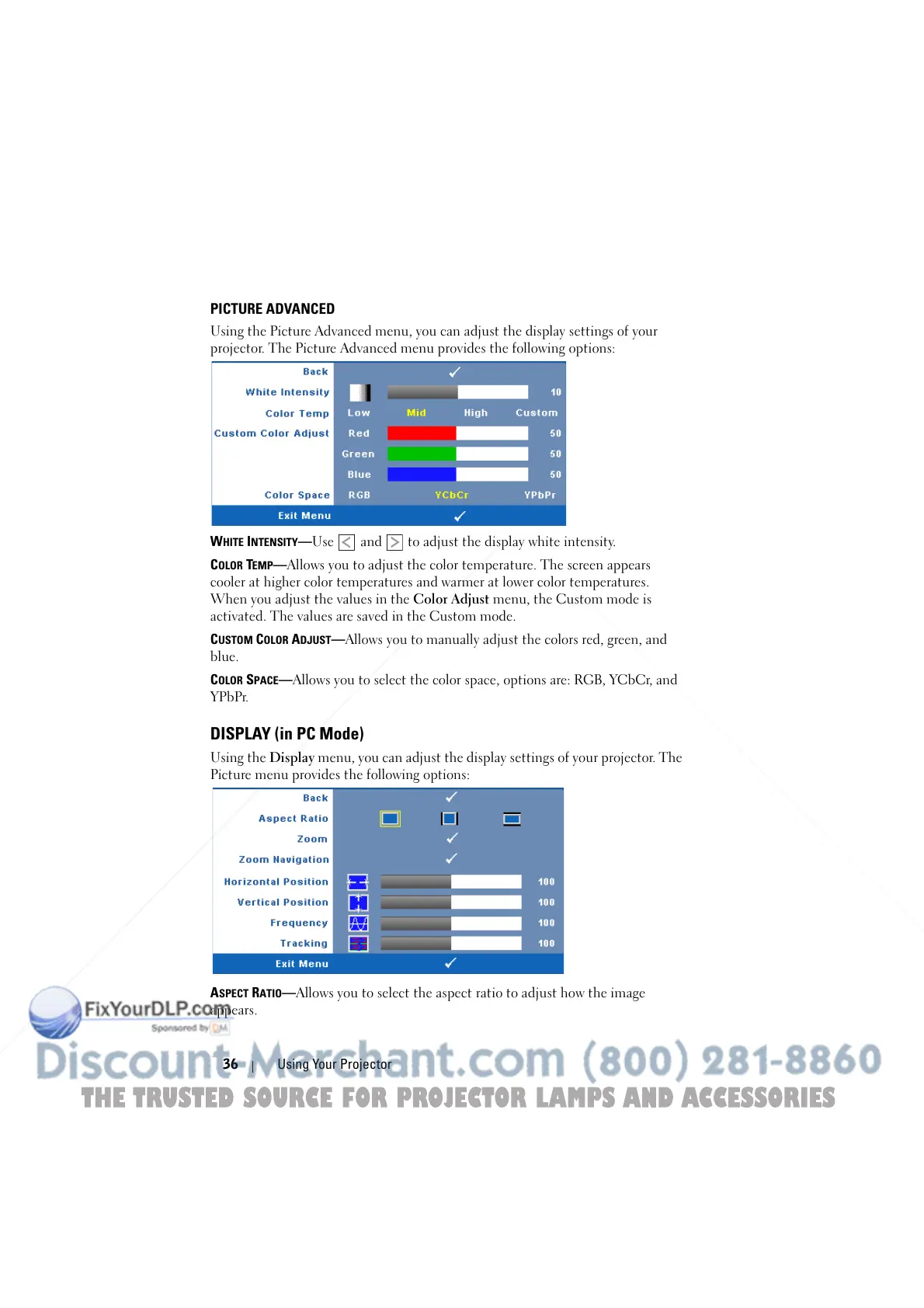 projector. The Picture Advanced menu provides the following options: