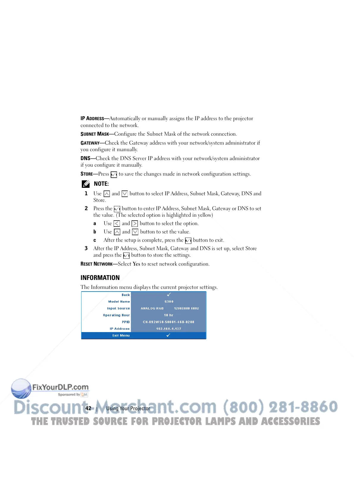 IP ADDRESS—Automatically or manually assigns the IP address to the projector