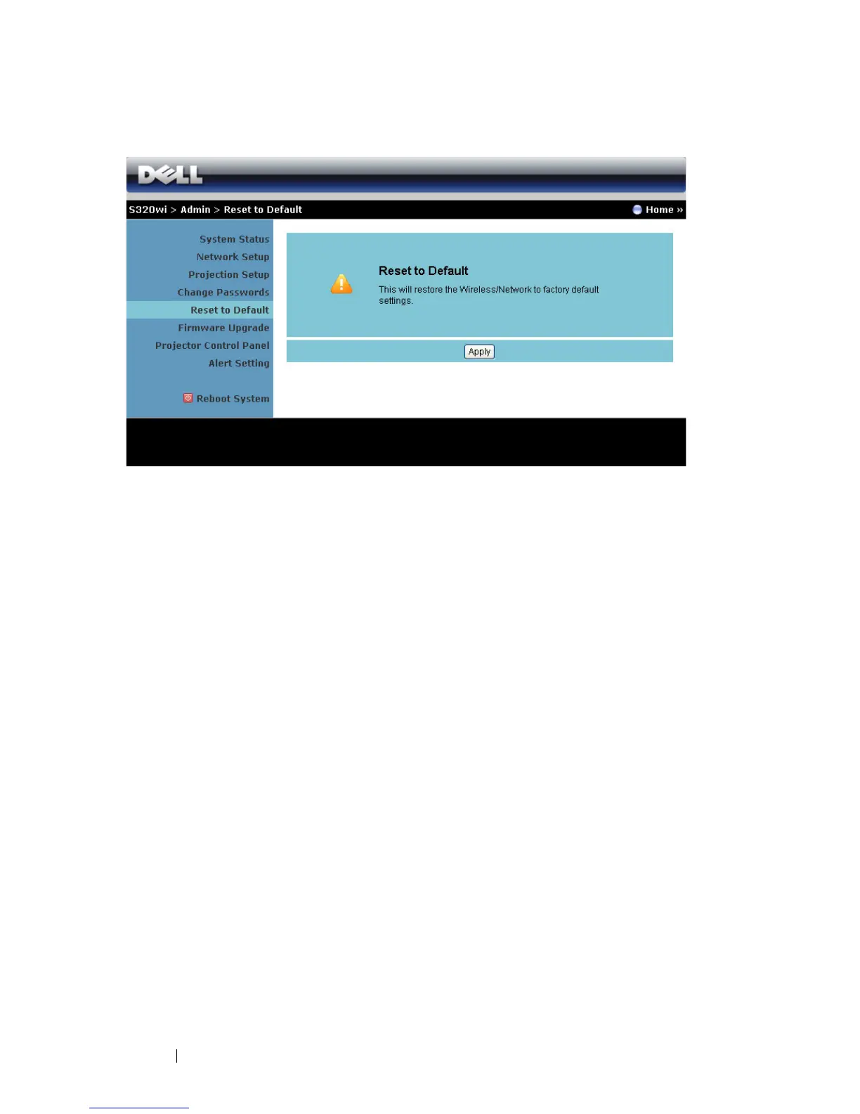 Click the Apply button to restore the wireless/network setup to its factory default