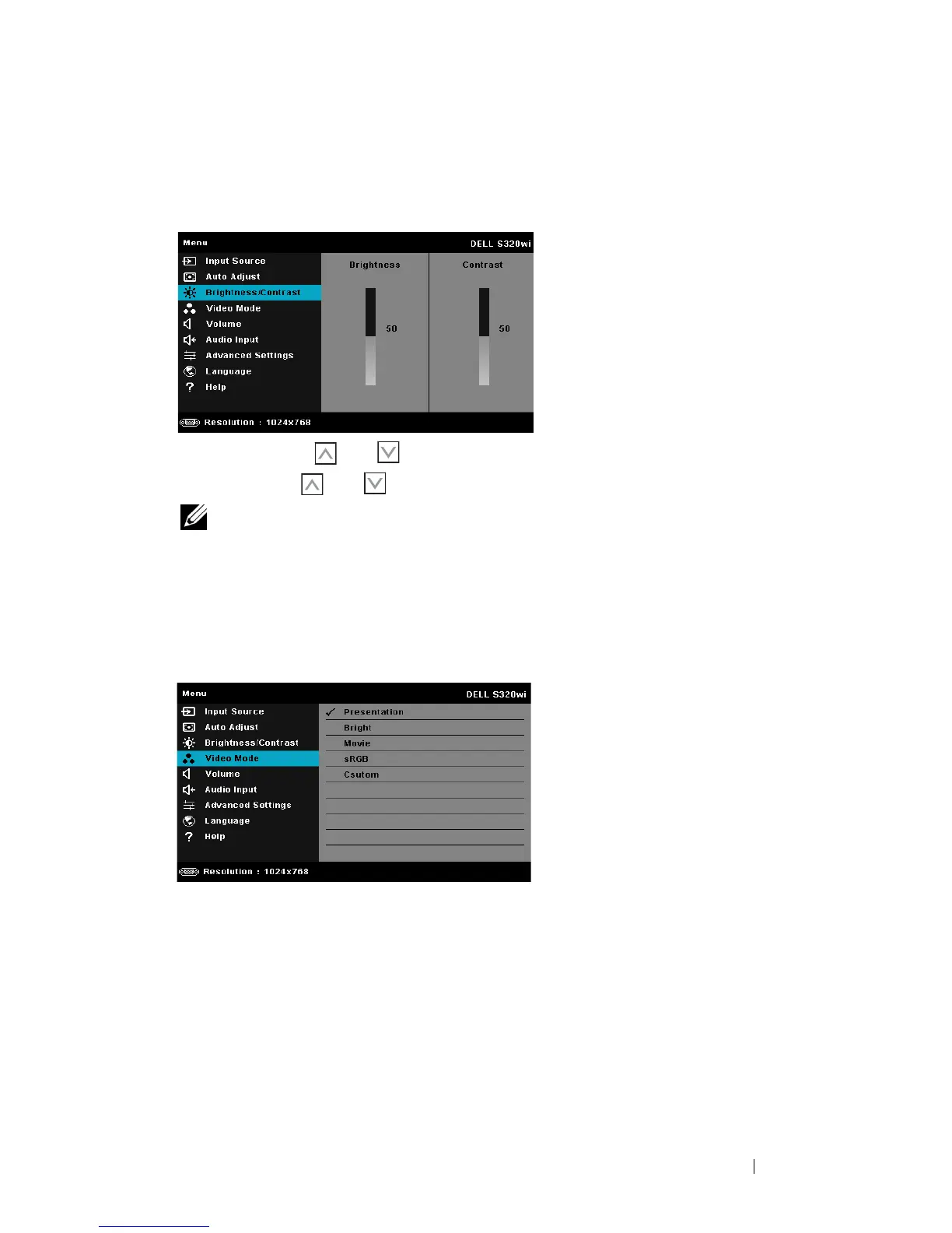 NOTE: If you adjust the settings for Brightness and Contrast the projector