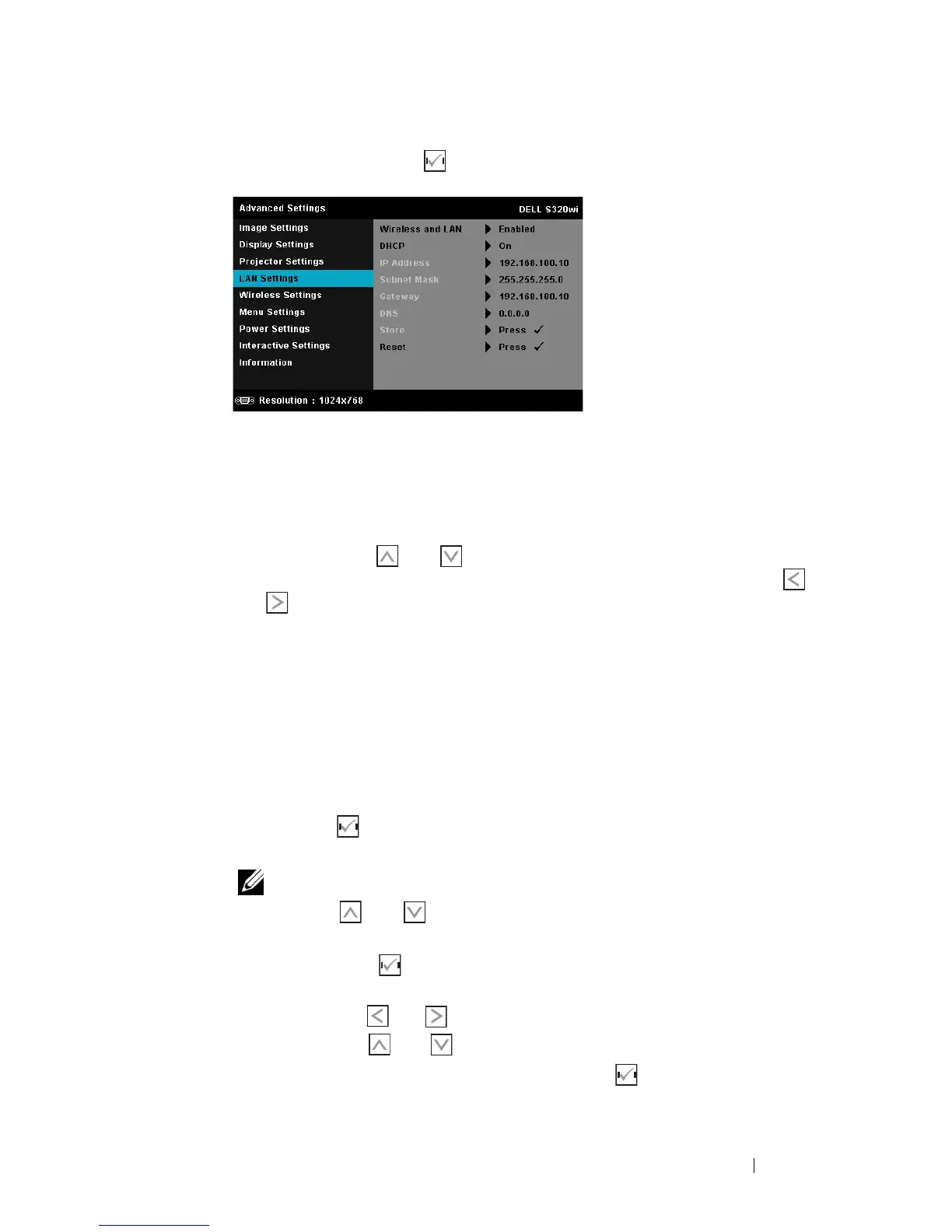 1. Use and button to select IP Address, Subnet Mask,