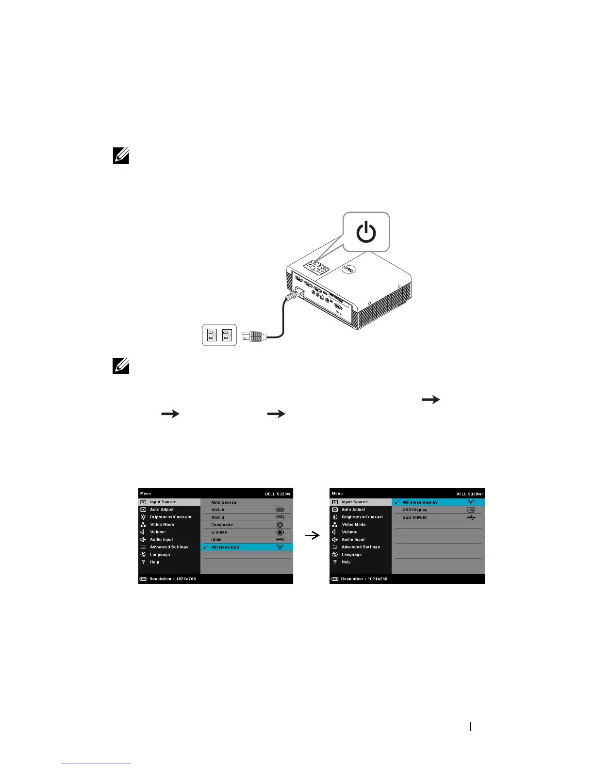 Connect the power cable and turn on the projector by pressing the power