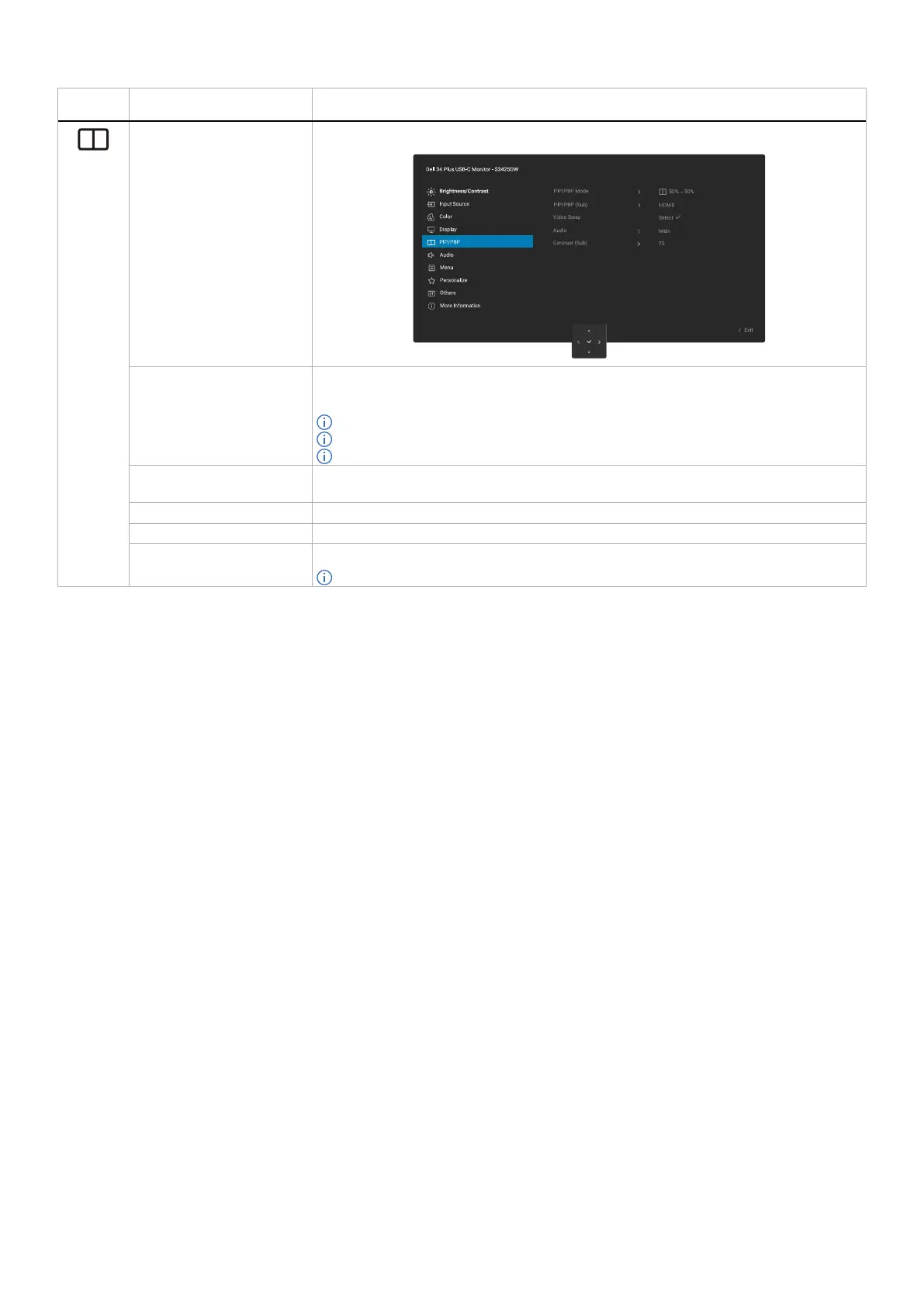 PIP/PBP (Sub) Allows you to select between USB-C, HDMI 1, or HDMI 2 video signal that may be connected