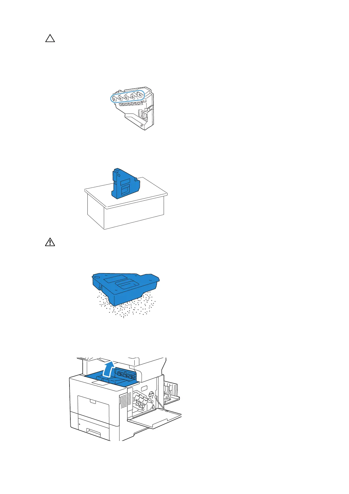 • Never lay the waste toner box on its side as this may cause its malfunction or toner spills.