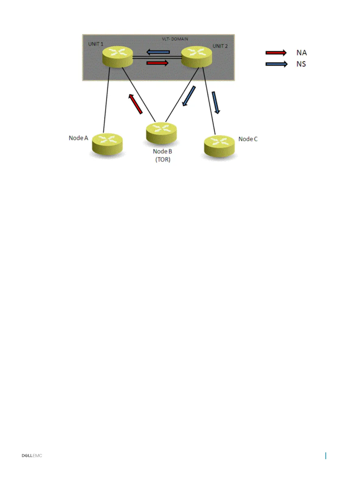 to another node, Node A, and Unit2 is linked to a node, Node C. The network between the ToR and the VLT nodes is Layer 2. Servers or